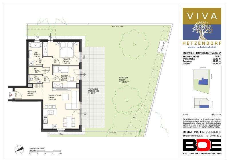Die Top 2 ist eine sehr helle ( Ost Süd West Ausrichtung ) 3 Zimmer Wohnung mit großer Terrasse ( 31,50 Quadratmeter ) und noch größerem Garten ( 115,56 Quadratmeter ).