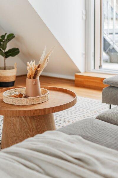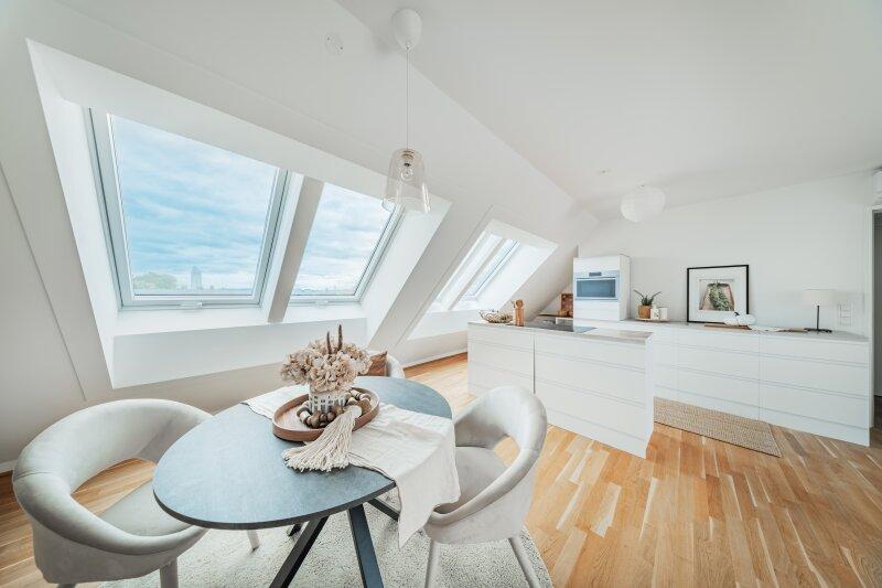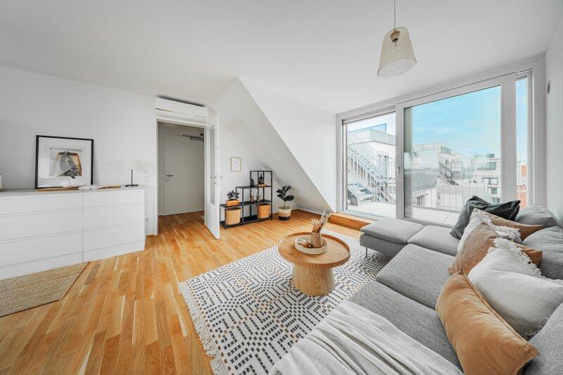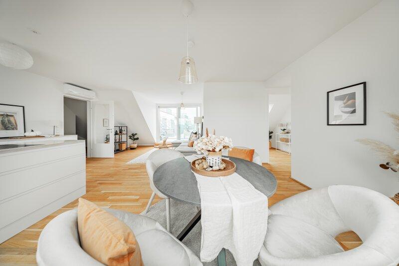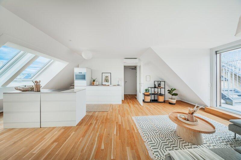 Die 2-Zimmer-Wohnung mit ca. 98 m² Wohnnutzfläche sowie einer Terrasse und einer privaten Dachterrasse befindet sich im 2. Dachgeschoss.