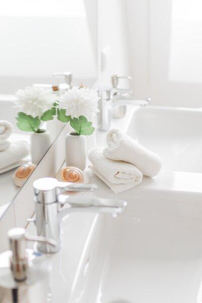 • Badezimmer (ca. 10 m²) mit Badewanne, Dusche, zwei Handwaschbecken, Toilette und einem Waschmaschinenanschluss