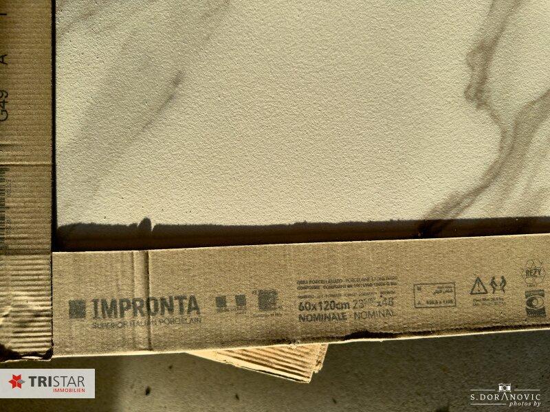 • Badezimmer Wände mit KNAUF verkleidet; Boden- und Wandbeläge aus hochwertigem italienischem Feinsteinzeug; Ausstattung aus hochwertiger Keramik Arbeitsplatte mit gegossenem Waschbecken, Unterschrank mit Schublade, abgetrennter Duschbereich mit Trennwand, montierte Armaturen und Duschmischer hoher Qualität, Spiegelschrank und Monoblock-WC