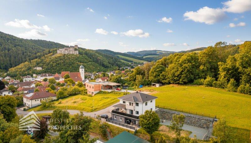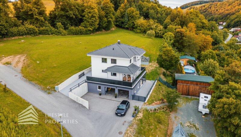 Wohnen, wo andere Urlaub machen! Dieses großzügige, moderne Einfamilienhaus in Holzriegelbauweise wurde 2014 errichtet und liegt in absoluter Ruhelage direkt am Waldrand mit herrlichem Blick auf die Burgruine Kirchschlag und freiem Ausblick ohne direkte Nachbarn. Die ca. 260 m² grosse Nutzfläche ist auf drei Ebenen unterteilt (KG, EG, OG). Im ganzen Haus ist eine Zentrale Staubsaugeranlage und ein Glasfaseranschluss für ultraschnelles Internet verbaut. Das traumhafte Haus wurde als Niedrigenergiehaus in Holzriegelbauweise erbaut. Es überzeugt mit moderner Wohnraumlüftung zur Kühlung im Sommer. Beheizt wird mittels Erdwärme. Zum Objekt gehört ein verpflichtend zu übernehmendes Inventar im Wert von 40.000EUR (nicht im Kaufpreis enthalten). Dieses umfasst unter anderem eine hochwertige Kücheneinrichtung, Badezimmermöbel im Obergeschoss und im Keller, einen Esstisch mit Stühlen, eine Garderobe mit Spiegelkasten, einen hochwertig verbauten Waschraum sowie eine praktische Werkzeugbank.