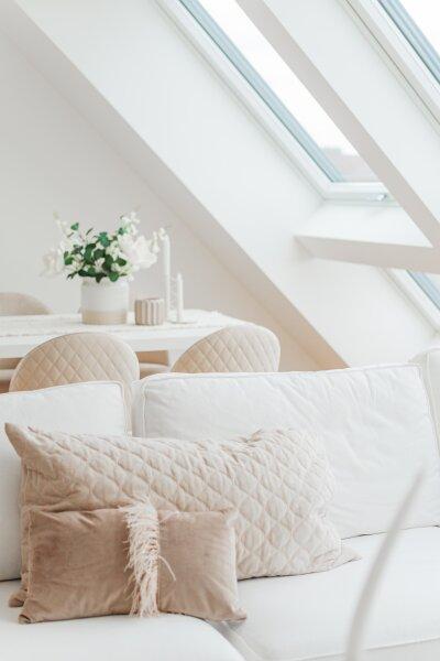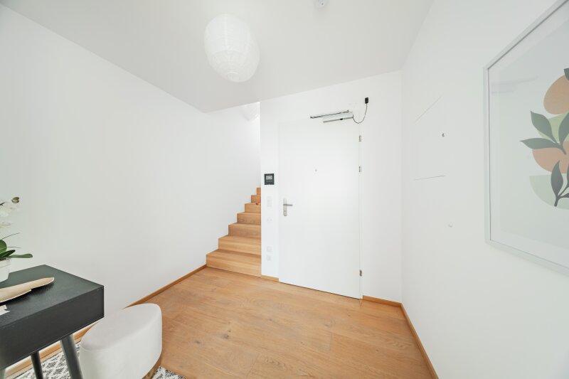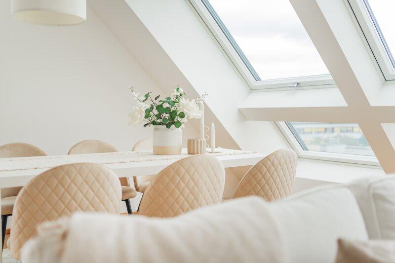 Das Penthouse selbst beeindruckt mit einer eleganten und modernen Gestaltung, die höchsten Wohnansprüchen gerecht wird. Großzügige Wohnbereiche bieten viel Platz für Entspannung und Unterhaltung, während die raumhohen Fensterflächen für eine lichtdurchflutete Atmosphäre sorgen und den Blick auf die umliegende Landschaft freigeben. Die erstklassige Ausstattung des Penthouse lässt keine Wünsche offen. Edle Eichenparkettböden, hochwertige Markensanitärprodukte und eine vollständig ausgestattete Küche verleihen dem Wohnraum einen Hauch von Luxus und Exklusivität. Eine Klimaanlage im Dachgeschoss sorgt auch an heißen Sommertagen für angenehme Temperaturen, während eine Paketboxenanlage und eine Videogegensprechanlage für Komfort und Sicherheit im Alltag sorgen.