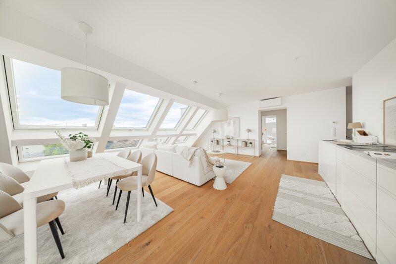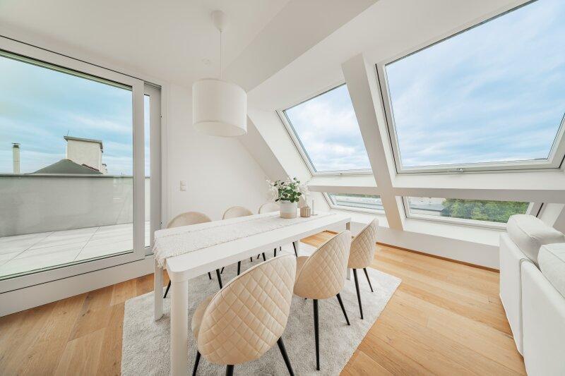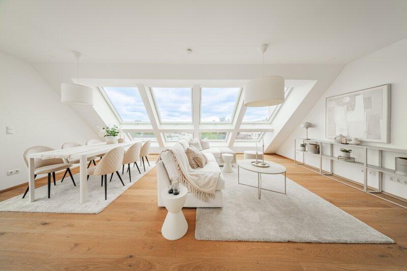 Das spektakuläre Penthouse im Neubauprojekt Fahrbachgasse 6-8 in Meidling erhebt sich über den Dächern der Stadt und bietet ein unvergleichliches Wohngefühl für anspruchsvolle Bewohner. Vereint mit seiner erstklassigen Lage im zukunftsweisenden Wohnprojekt in Meidling, verspricht es luxuriöse Lebensqualität gepaart mit urbaner Raffinesse. Das Herzstück dieses außergewöhnlichen Penthouse ist zweifellos die atemberaubende Panoramaaussicht, die sich über die Stadt erstreckt und jeden Tag mit neuen Impressionen begeistert. Von der großzügigen Terrasse und der Dachterrasse aus können Bewohner den Blick über die Dächer von Wien schweifen lassen und dabei das pulsierende Leben der Stadt genießen.