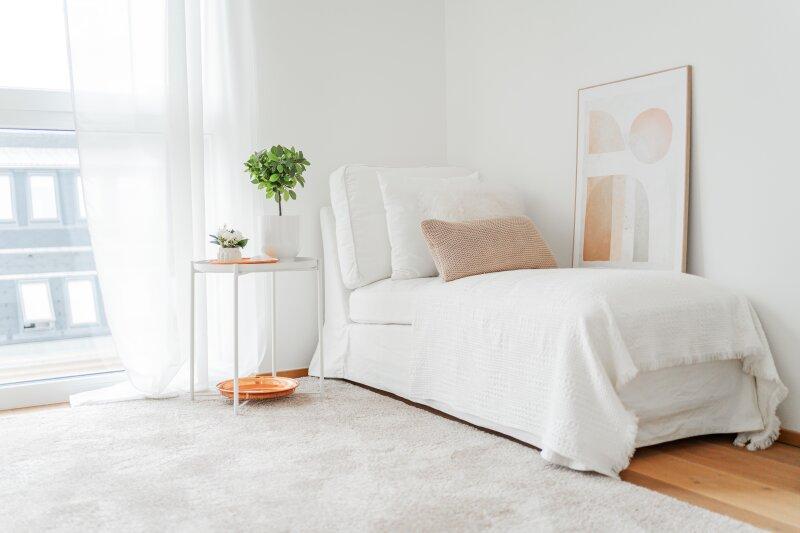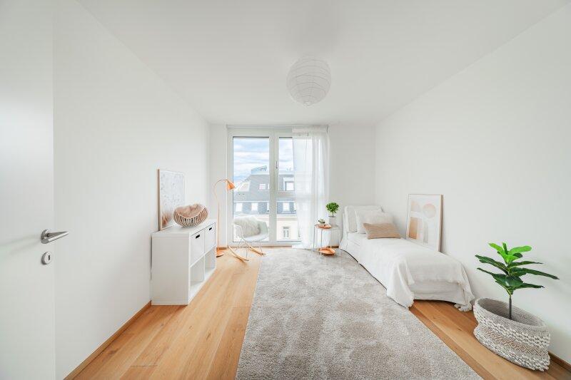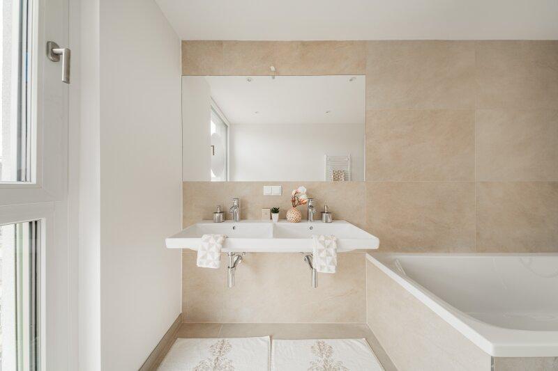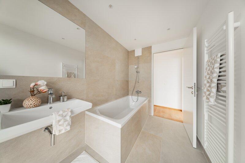 Die modernen Wohneinheiten sind mit Parkett und Fußbodenheizung ausgestattet. Das sorgt nicht nur für warme Füße, auch die Energiekosten können dank Fernwärme gesenkt werden. Außenliegender, elektrisch gesteuerter Sonnenschutz und Klimaanlagen im Dachgeschoß versprechen perfekt temperierte Sommertage. Die hochwertig ausgestatteten Bäder wurden als wahre Wohlfühlzonen konzipiert. Eine perfekte Symbiose aus Funktionalität und Design verstärkt dabei den Wellness-Faktor.