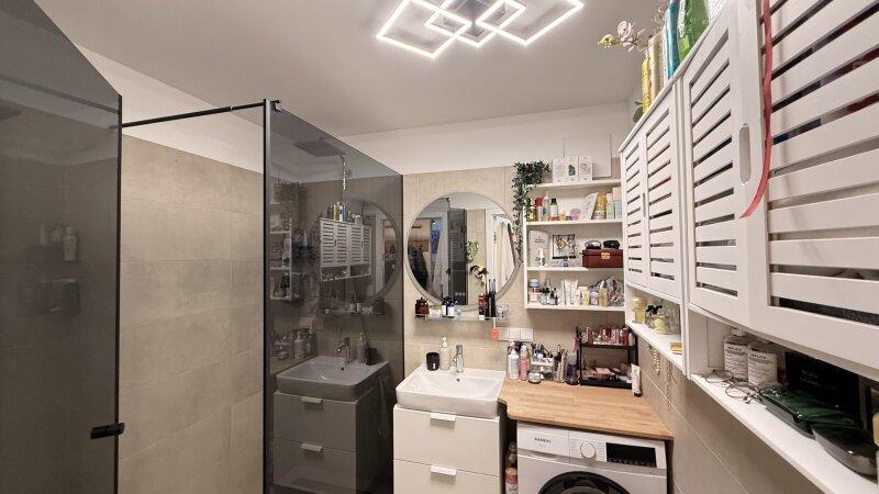 Das Bad ist mit einer bodenebenen Dusche mit Rainshower und Feinsteinzeugfliesen ausgestattet. Das Badezimmer und WC sind auch sauber verfliest und modern verglast.