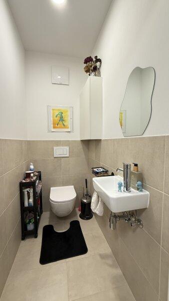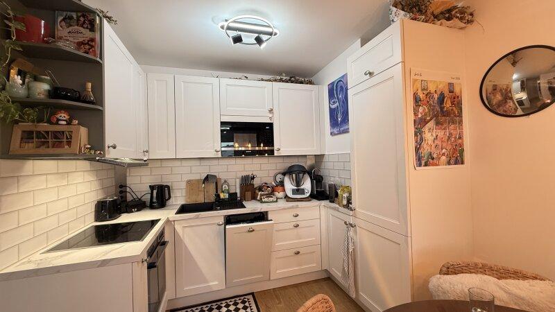Die Küche ist mit Geräten ausgestattet: Backrohr, Ceranfeld, Dunstabzugshaube, Geschirrspüler. Nebenan befindet sich ein praktischer Abstellraum und beim Eingang ein separat angelegtes WC und das Bad nebenan.