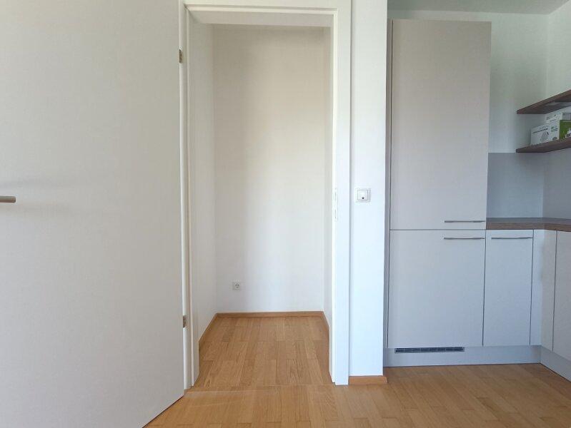 Die moderne Einbauküche verfügt über Ceran-Kochfeld, Backofen, Dunstabzug, sowie Geschirrspüler und Kühlschrank mit Gefrierfach. Ein praktischer Abstellraum mit einer Fläche von rund 0,85 m² ergänzt das Raumangebot und bietet zusätzlichen Stauraum.