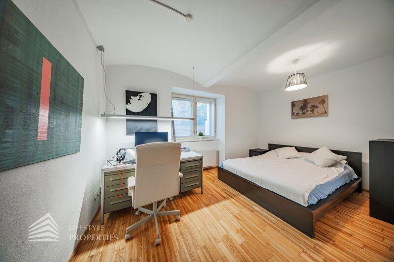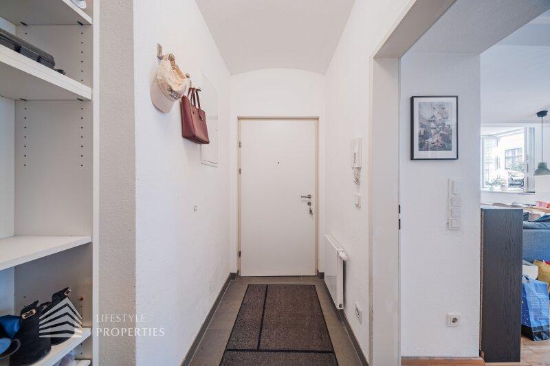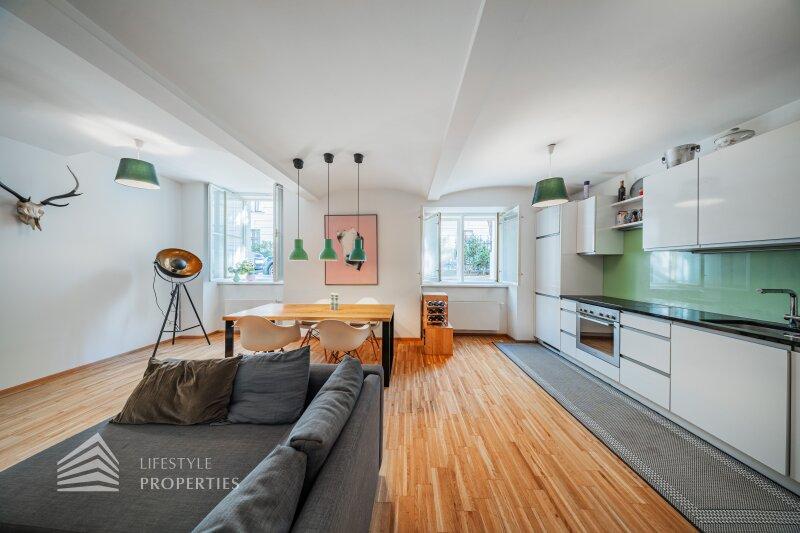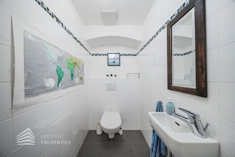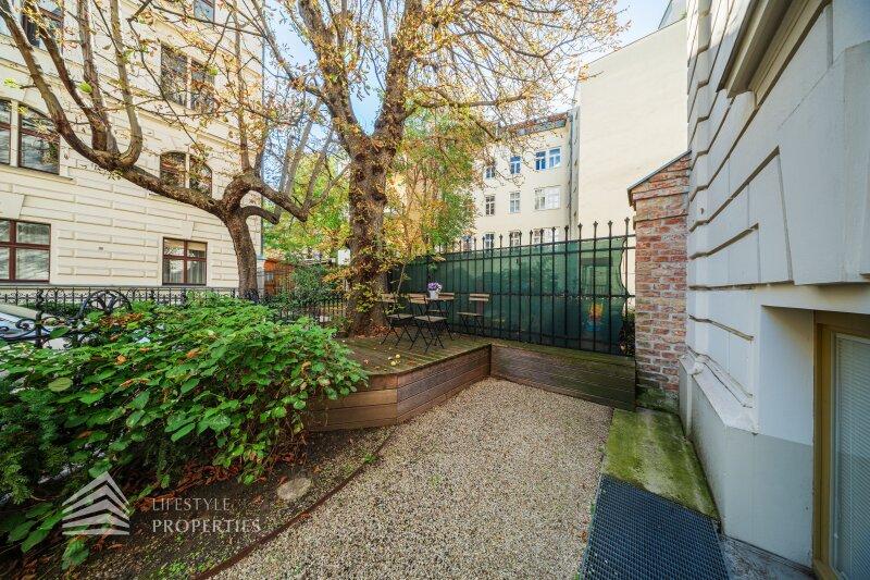 Beim Betreten der Wohnung empfängt Sie ein ca. 3 m² großer, einladender Vorraum, der einen praktischen Zugang zur separat gelegenen Toilette bietet. Linkerhand öffnet sich der Weg in die großzügige, lichtdurchflutete ca. 30 m² große Wohnküche, das Herzstück der Wohnung, das durch seine Helligkeit und Offenheit besticht. Von hier aus erreichen Sie sowohl das gemütliche Schlafzimmer als auch das stilvoll ausgestattete Badezimmer. Dieses verfügt neben einer Badewanne und einem eleganten Handwaschbecken über eine zweite Toilette ideal für zusätzlichen Komfort. Ein besonderes Highlight dieser Wohnung ist der direkte Zugang zum eigenen ca. 33 m² großen Garten mit Terrasse mit erhöhter Sitzgelegenheit ein idealer Ort zur Entspannung. Der ca. 100 Jahre alte Kastanienbaum bietet kühlenden Schatten mitten in der Stadt. Dank der ruhigen Lage in einer Einbahnstraße können Sie hier ungestört die Ruhe genießen.