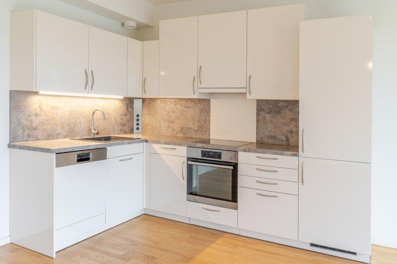 • Großes Wohnzimmer mit exklusiver ewe-Küche (Herd, Backofen, Geschirrspüler, Kühlschrank) mit französischen Fenstern und Zugang zur Loggia