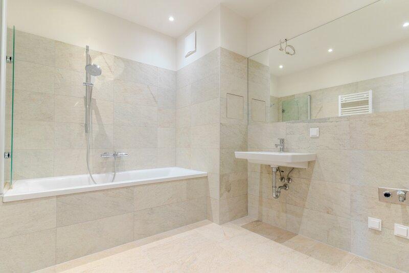 • Badezimmer mit Badewanne und Waschmaschinen-Anschluss