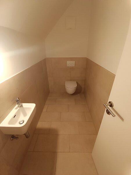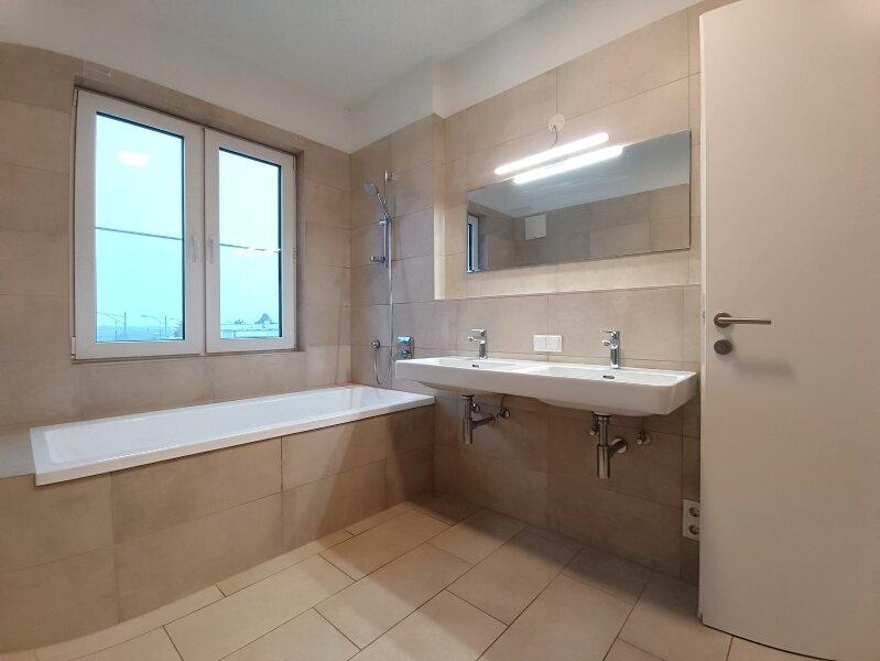 Vom Vorraum aus erreichen Sie die separate Toilette mit Handwaschbecken, sowie das Badezimmer mit Doppel-Waschbecken, Handtuch-Heizkörper und Badewanne.