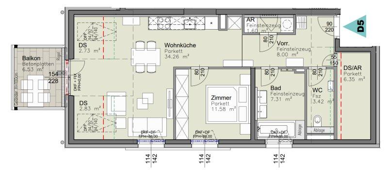 Die Wohnküche bietet eine Fläche von rund 34,26 m² und bausreichend Platz für die persönliche Einrichtung und Gestaltung. Der hochwertige Küchenverbau bietet eine Ausstattung, die keine Wünsche offen lässt. Ceran-Kochfeld, Backoffen, Dunstabzug, Geschirrspüler und Kühlschrank mit Gefrierfach. Alles ist vorhanden und dem entspannten Kochen steht nichts mehr im Weg.
