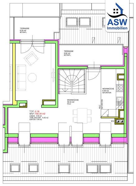 Diese perfekt aufgeteilte 3-Zimmer-Maisonettwohnung mit 2 Terrassen in einem sehr zentral gelegenen, im Jahr 2011 erbauten, Gebäude steht zum Verkauf: