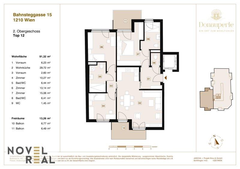 Top 12 ist eine großzügige 4-Zimmer-Wohnung im zweiten Obergeschoss mit einer Gesamtwohnfläche von 91,16 m². Die Wohnung überzeugt durch ihre durchdachte Raumaufteilung, zwei Badezimmer, drei Schlafzimmer und eine große Wohnküche. Zwei Balkone bieten zusätzlichen Wohnkomfort und erweitern den Wohnraum ins Freie.