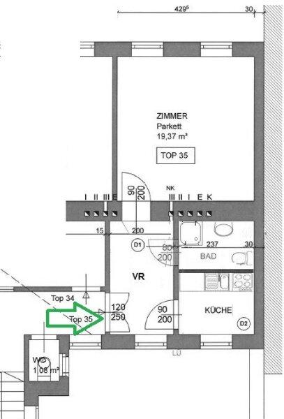 Die Wohnung hat eine Größe von ca. 34,56 m² und befindet sich im 3. Stock eines Stilaltbaus aus der Jahrhundertwende mit glatter Fassade und einladendem Entree. Sie gliedert sich in einen Vorraum, einen Wohn- Schlafraum, eine Küche, ein Bad mit Dusche und ein separates WC.