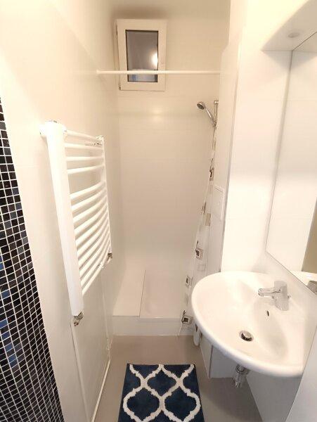 Das Badezimmer ist mit einer Kombination aus grauen Bodenfliesen, weißen Wandfliesen, sowie Mosaikfliesen in Dunkelblau nicht nur optisch ansprechend, sondern bietet mit Dusche, Handtuch-Heizkörper, Waschbecken, sowie Toilette eine effektive Nutzung der 2,69 m² Fläche. Klein aber fein ist auch hier die Devise und einem entspannten Start in den Tag steht nichts im Weg.