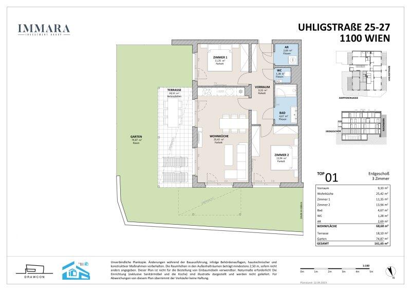 Zum Verkauf gelangt diese perfekt geschnittene Dreizimmerwohnung mit einem ca. 26 m2 großem Balkon im 1. Liftstock eines sehr geschmackvollen Neubauhauses (Fertigstellung November 2025) in Grün-Ruhelage.  Diese hochwertig ausgestattete Wohnung verfügt über einen ca. 75m2 großen Garten (zzgl. 18 m2 Terrasse), welcher von allen drei Zimmern zugänglich ist.