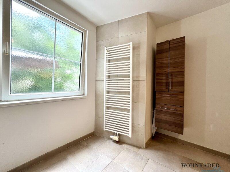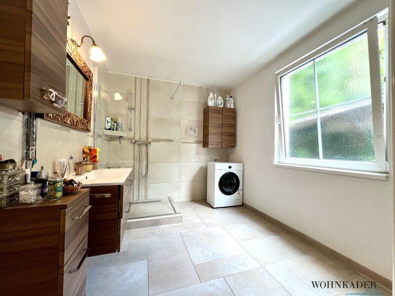 Links vom Eingangsbereich erreichen Sie das separate WC, das komfortable Badezimmer mit Fenster und Dusche sowie das Schlafzimmer, das über eine elegante Glastür ebenfalls Zugang in den Garten bietet.