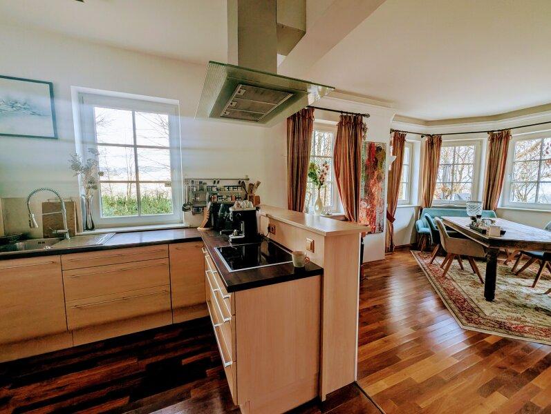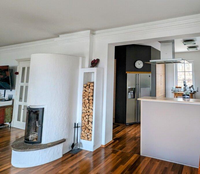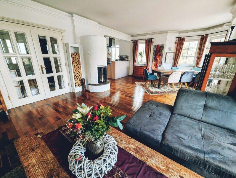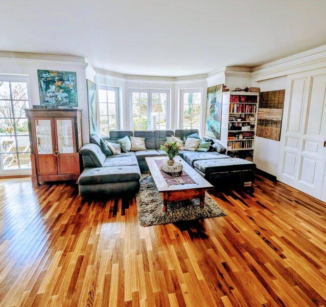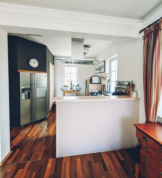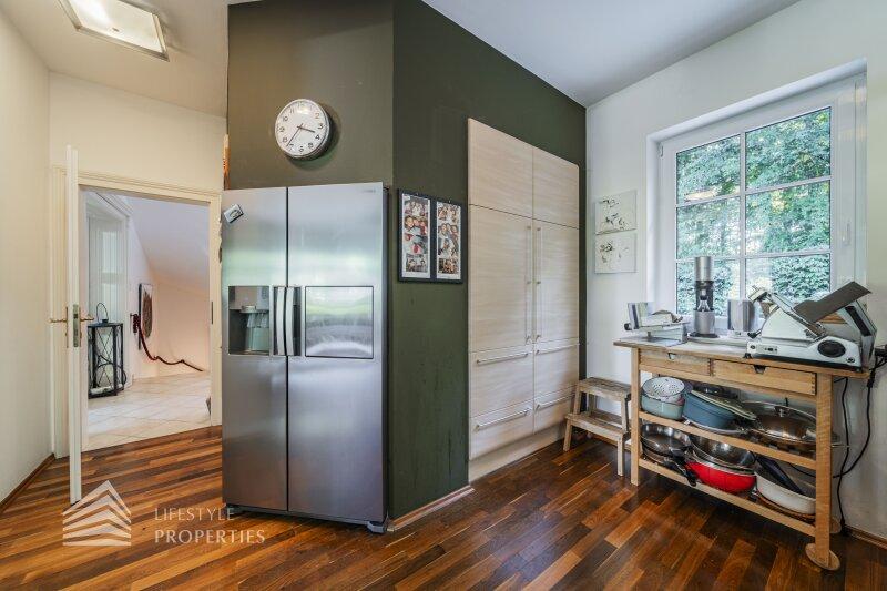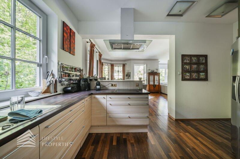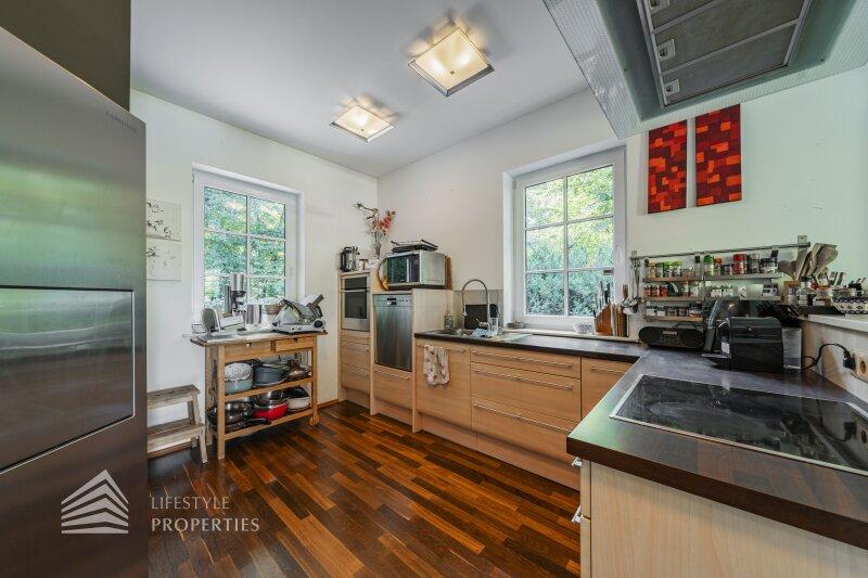 Sie betreten die Villa und befinden sich im Entrée, welches Sie direkt in den ca.48 m² großen, lichtdurchfluteten Salon mit traumhaftem Blick in den Garten führt. Der Raum bietet ausreichend Platz für einen schönen Wohn- und Essbereich, der stilvolle Kamin der österreichischen Firma Biofire schafft zusätzlich einen besonderen Gemütlichkeitsfaktor. Die hochwertige, von Bulthaup geplante, Design-Küche ist mit großem side-by-side Kühlschrank, Herd mit großer Dunstabzugshaube, Backofen und Geschirrspüler ausgestattet und bietet reichlich Stauraum sowie eine separate Speisekammer.