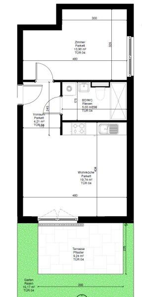 Beim Betreten der Wohnung gelangen Sie in einen Eingangsbereich, der Sie direkt zur lichtdurchfluteten Wohnküche führt. Mit einer Fläche von ca. 20 m² bietet dieser Raum verschiedene Gestaltungsmöglichkeiten für separate Wohn- und Essbereiche. Von hier aus erreichen Sie auch die Terrasse und den Garten, die zu entspannten Momenten an der frischen Luft einladen. Das ca. 14 m² große Schlafzimmer befindet sich links der Eingangstüre. Ein modernes Badezimmer mit begehbarer Dusche, Waschtisch und Anschluss für die Waschmaschine liegt gegenüber der Eingangstüre.