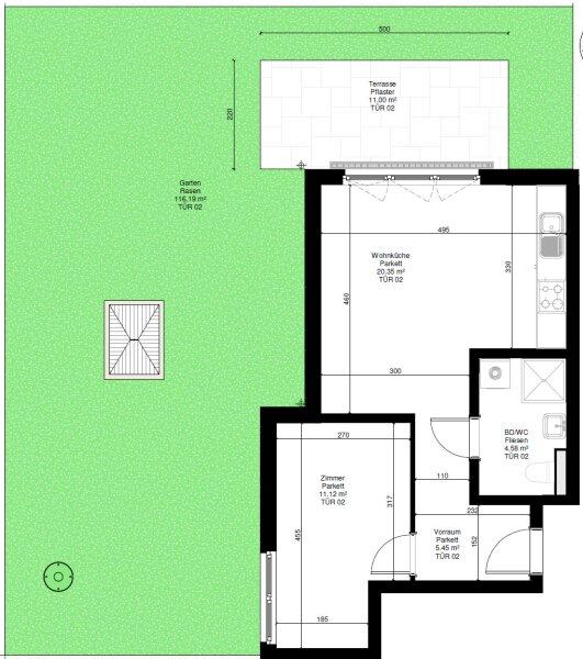 Beim Betreten der Wohnung gelangen Sie in einen ca. 5 m² großen Eingangsbereich, der Sie geradedurch in das ca. 11 m² große Schlafzimmer führt. Weiters führt Sie der Vorraum direkt zur lichtdurchfluteten Wohnküche. Mit einer Fläche von etwa 20 m² bietet dieser Raum verschiedene Gestaltungsmöglichkeiten für separate Wohn- und Essbereiche. Von hier aus erreichen Sie auch die Terrasse und den Garten, die zu entspannten Momenten an der frischen Luft einladen. Ein modernes Badezimmer mit begehbarer Dusche, Waschtisch und Anschluss für die Waschmaschine, kann über den Eingangsbereich betreten werden.