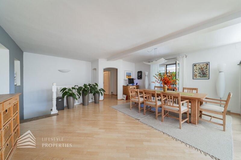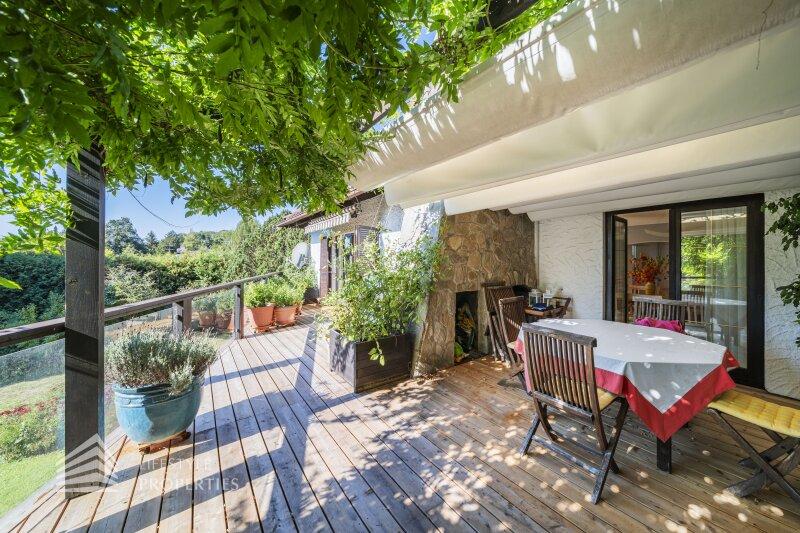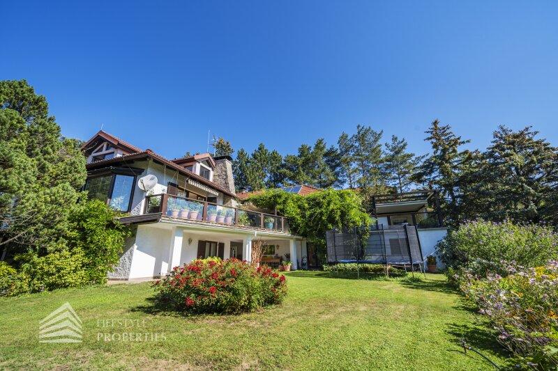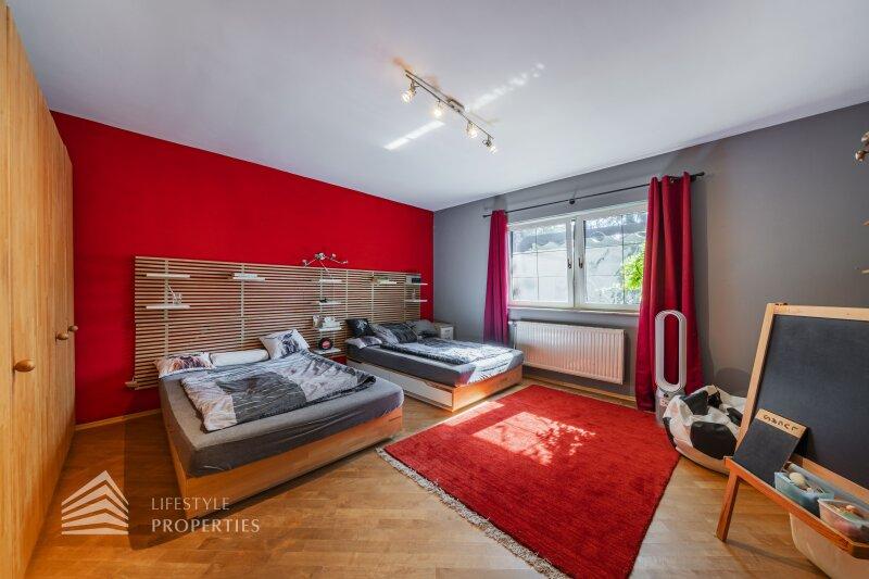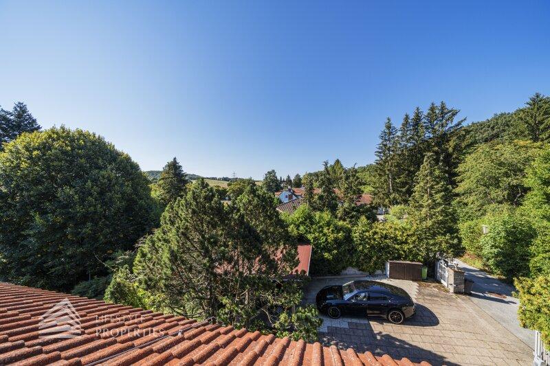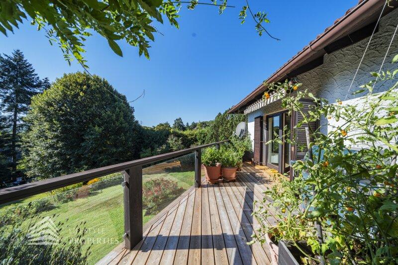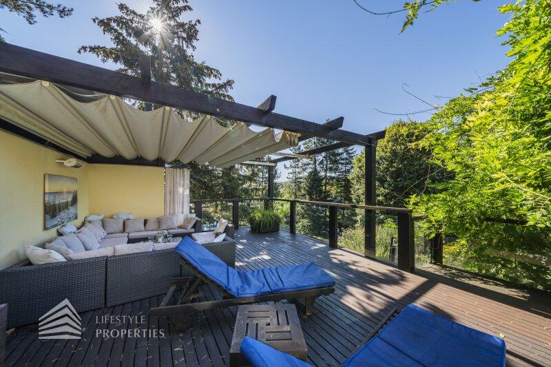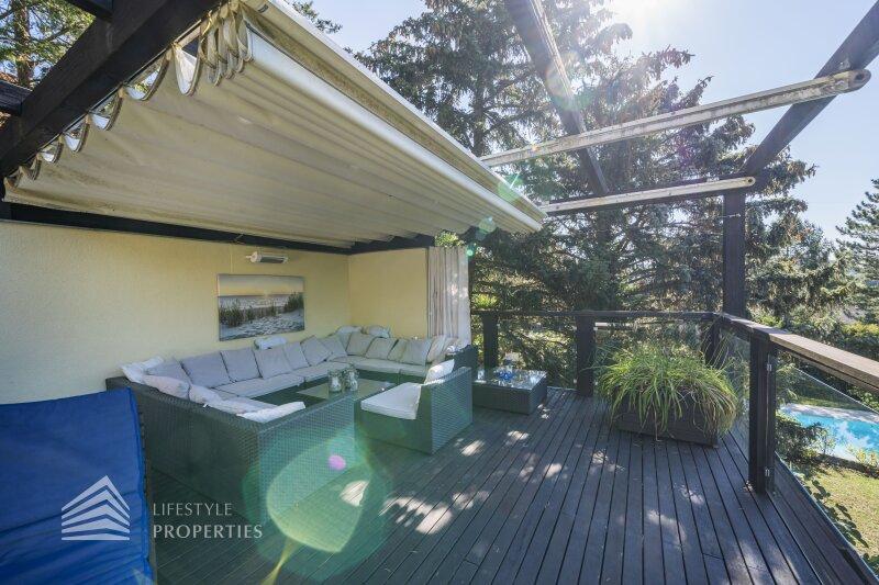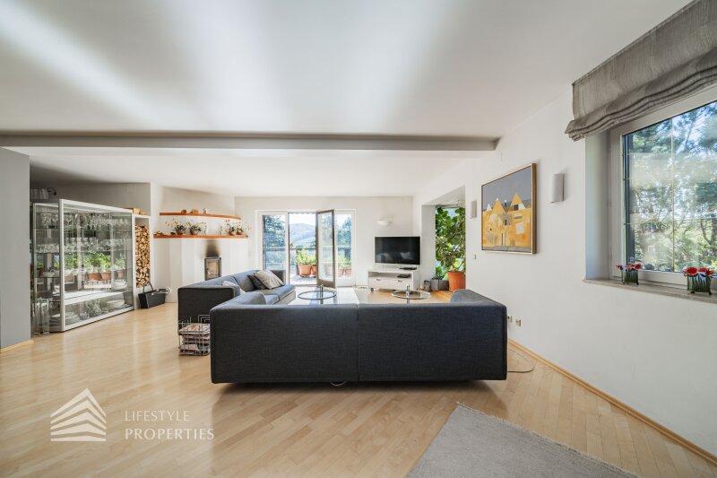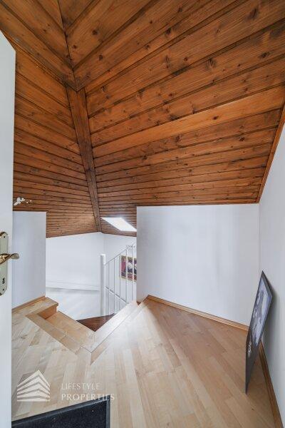 Über die Stiegen gelangen Sie in das Obergeschoß des Hauses und befinden sich direkt im großzügigen Wohn- und Essbereich. Ein Durchgang führt in die hochwertig ausgestattete Küche. Diese besitzt einen kleinen Essbereich, welcher auf einen ca. 1,90 m² Balkon führt und ebenso über eine Speisekammer verfügt. In diesem Geschoß finden Sie ebenso ein WC und ein exklusives, geräumiges Bad, welches über eine Badewanne und eine Dusche verfügt. Anbei befinden sich zwei Schlafzimmer. Das kleinere der beiden bietet sich als Kinderzimmer an, während das hintere und größere der beiden sich ideal als Master-Bedroom eignet. Ein besonderes Highlight dieser Immobilie ist die ca. 42 m² große Terrasse, die über den Wohnbereich begehbar ist. Durch einen Zubau 2006 wurde die Terrasse um einen Lounge Bereich erweitert und bietet neben dem wunderschönen Ausblick auf den Baumbestand im Garten auch genügend Platz für Sitzgelegenheiten. Im Sommer bietet sich dieser Terrassenbereich für diverse Feiern und Partys an und für den Fall eines eher kühleren Abends versorgt die Heizlampe die Gäste mit ausreichend Wärme.