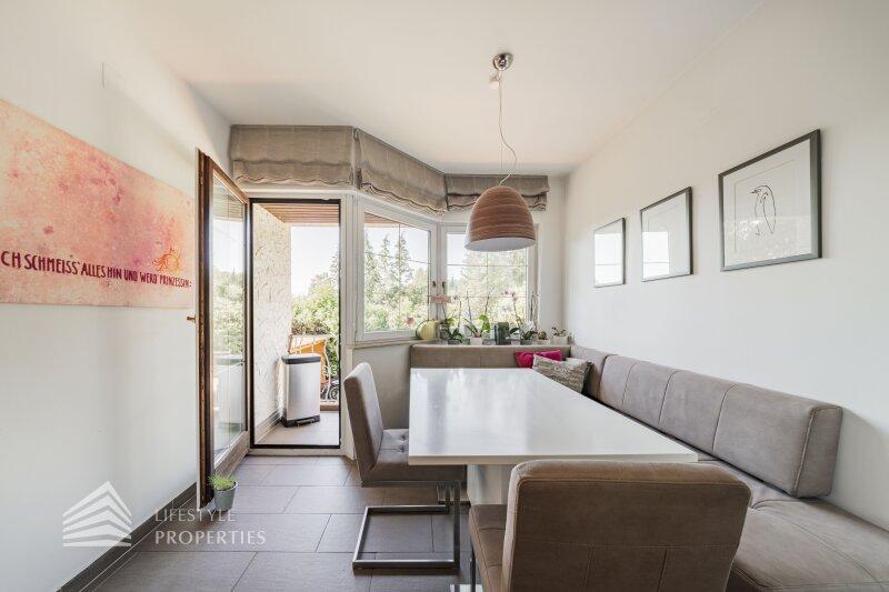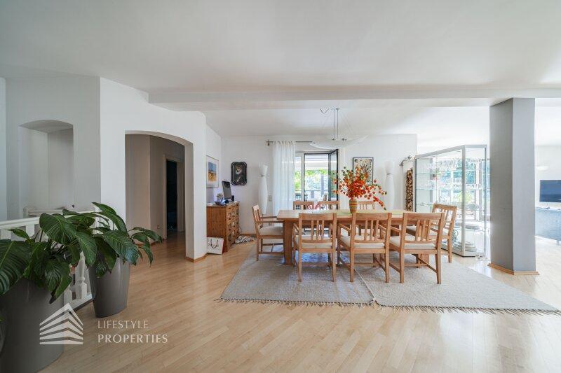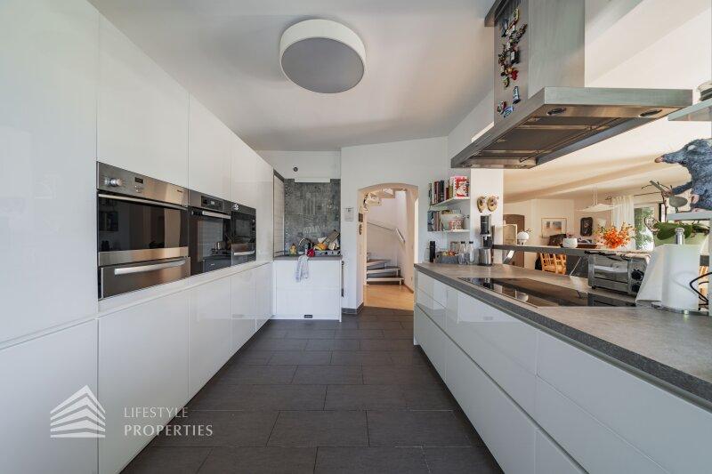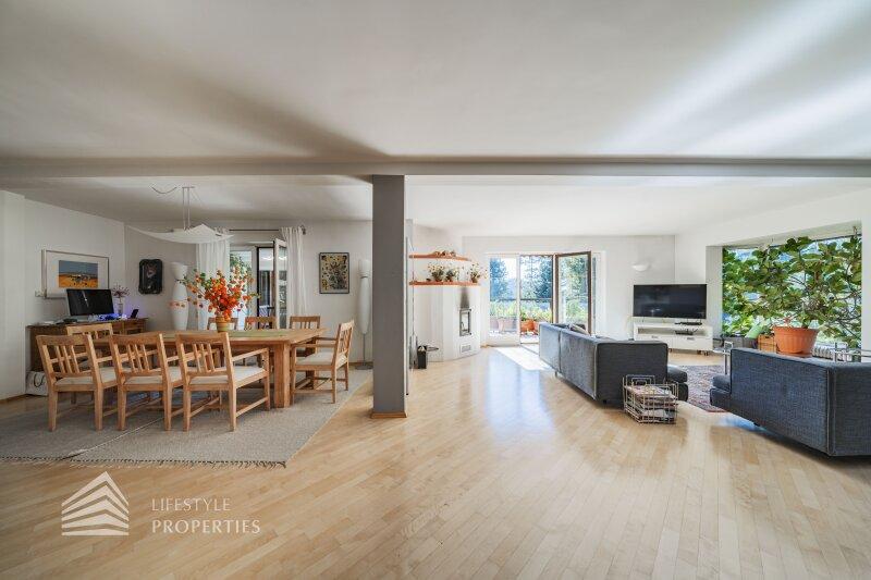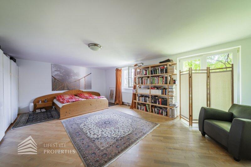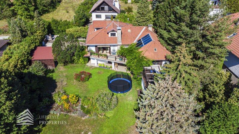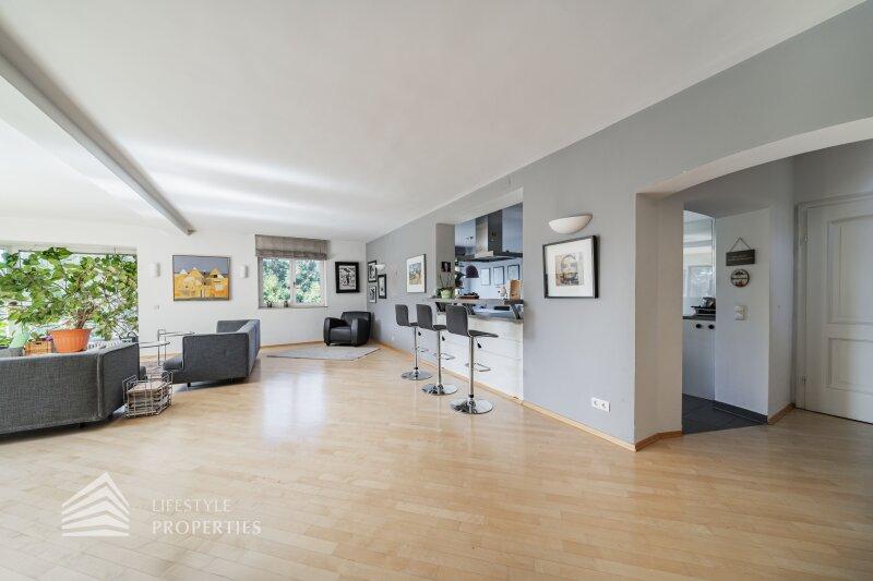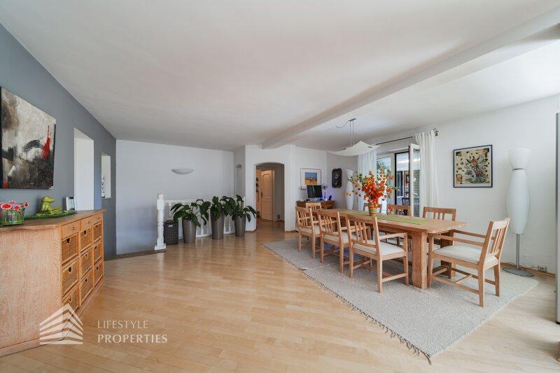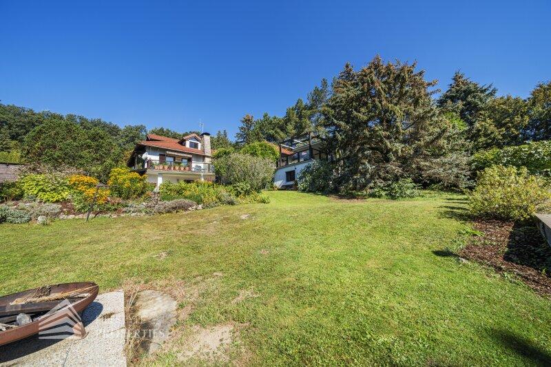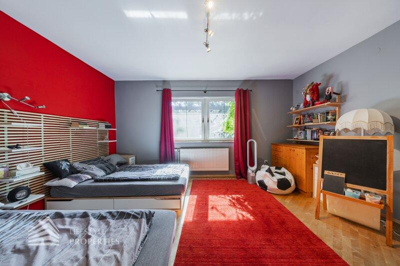Über die Stiegen gelangen Sie in das Obergeschoß des Hauses und befinden sich direkt im großzügigen Wohn- und Essbereich. Ein Durchgang führt in die hochwertig ausgestattete Küche. Diese besitzt einen kleinen Essbereich, welcher auf einen ca. 1,90 m² Balkon führt und ebenso über eine Speisekammer verfügt. In diesem Geschoß finden Sie ebenso ein WC und ein exklusives, geräumiges Bad, welches über eine Badewanne und eine Dusche verfügt. Anbei befinden sich zwei Schlafzimmer. Das kleinere der beiden bietet sich als Kinderzimmer an, während das hintere und größere der beiden sich ideal als Master-Bedroom eignet. Ein besonderes Highlight dieser Immobilie ist die ca. 42 m² große Terrasse, die über den Wohnbereich begehbar ist. Durch einen Zubau 2006 wurde die Terrasse um einen Lounge Bereich erweitert und bietet neben dem wunderschönen Ausblick auf den Baumbestand im Garten auch genügend Platz für Sitzgelegenheiten. Im Sommer bietet sich dieser Terrassenbereich für diverse Feiern und Partys an und für den Fall eines eher kühleren Abends versorgt die Heizlampe die Gäste mit ausreichend Wärme.