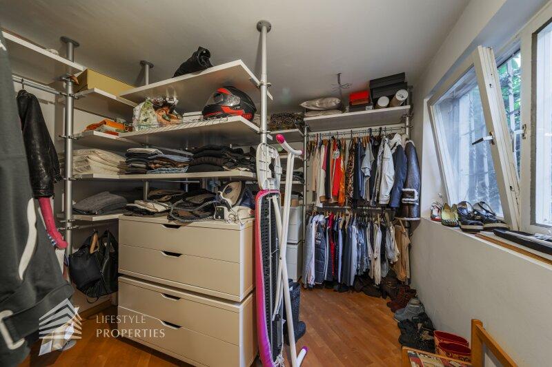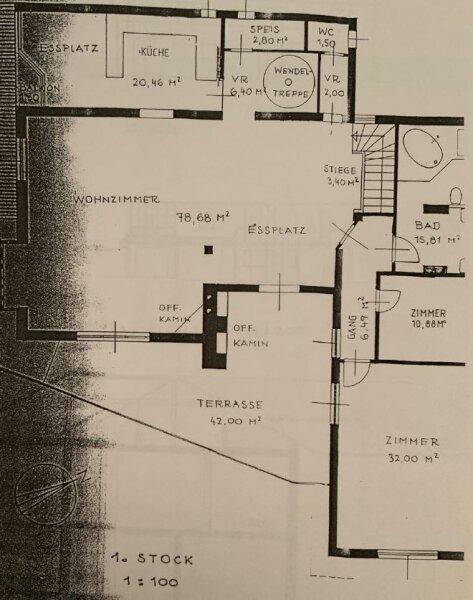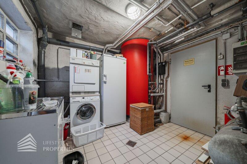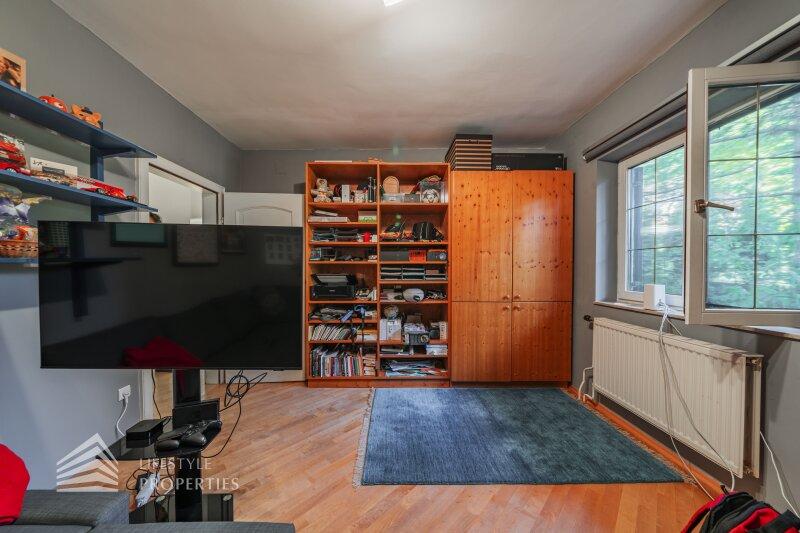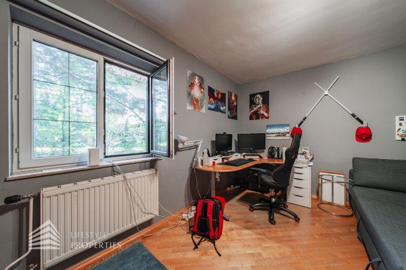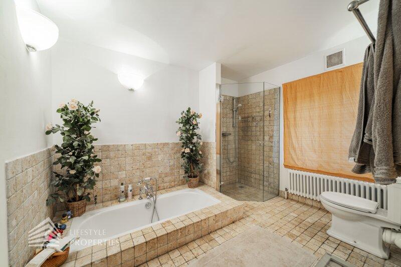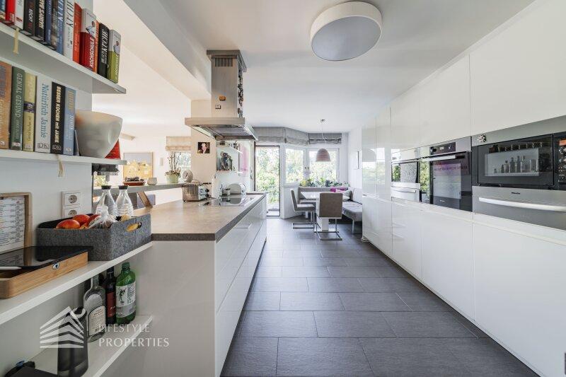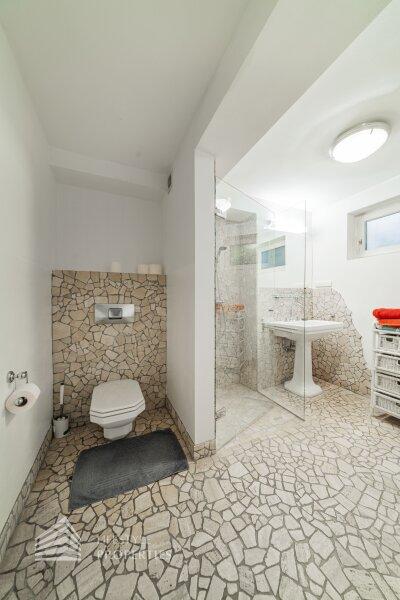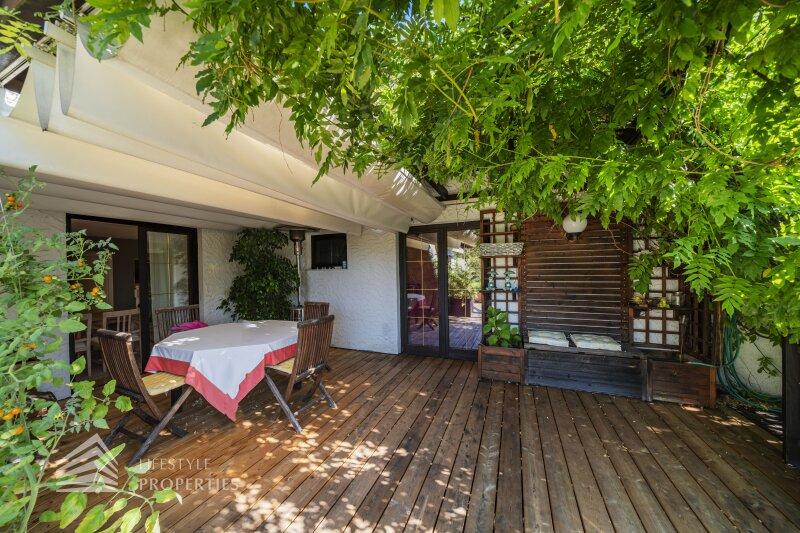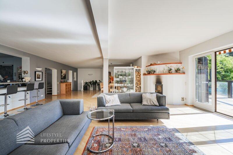 Über die Stiegen gelangen Sie in das Obergeschoß des Hauses und befinden sich direkt im großzügigen Wohn- und Essbereich. Ein Durchgang führt in die hochwertig ausgestattete Küche. Diese besitzt einen kleinen Essbereich, welcher auf einen ca. 1,90 m² Balkon führt und ebenso über eine Speisekammer verfügt. In diesem Geschoß finden Sie ebenso ein WC und ein exklusives, geräumiges Bad, welches über eine Badewanne und eine Dusche verfügt. Anbei befinden sich zwei Schlafzimmer. Das kleinere der beiden bietet sich als Kinderzimmer an, während das hintere und größere der beiden sich ideal als Master-Bedroom eignet. Ein besonderes Highlight dieser Immobilie ist die ca. 42 m² große Terrasse, die über den Wohnbereich begehbar ist. Durch einen Zubau 2006 wurde die Terrasse um einen Lounge Bereich erweitert und bietet neben dem wunderschönen Ausblick auf den Baumbestand im Garten auch genügend Platz für Sitzgelegenheiten. Im Sommer bietet sich dieser Terrassenbereich für diverse Feiern und Partys an und für den Fall eines eher kühleren Abends versorgt die Heizlampe die Gäste mit ausreichend Wärme.
