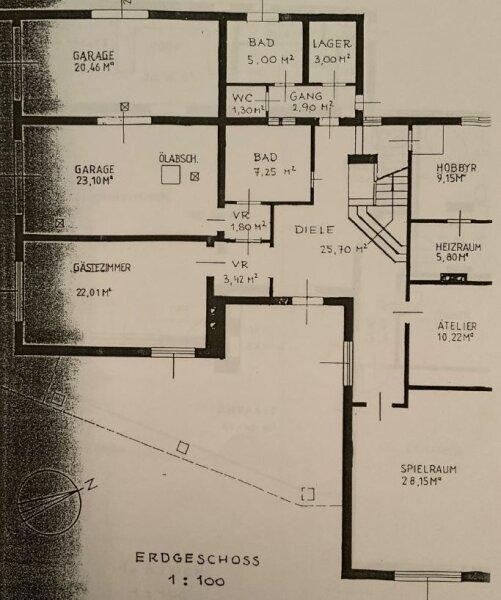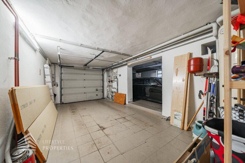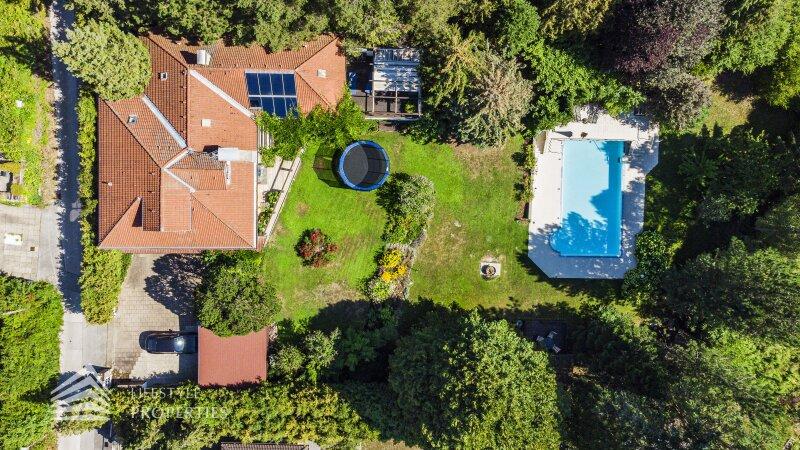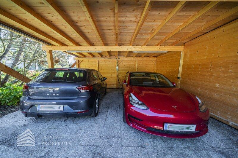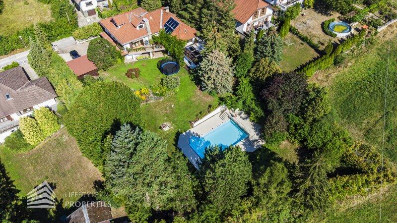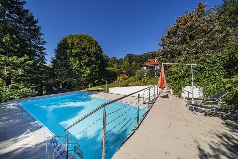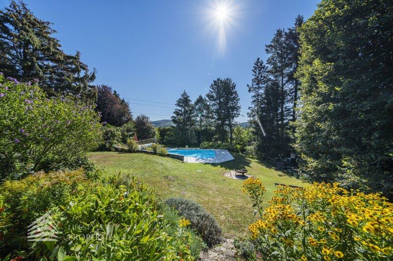 Die Lage der Immobilie überzeugt vor allem durch ihre absolute Ruhelage. Der große prächtige Garten, welcher sehr gepflegt ist und einen sehr alten Baumbestand vorweist, bietet Ihnen einerseits einen Pool mit 12 x 6 Metern Länge, der über eine elektrisch bedienbare Rollabdeckung verfügt. Anderseits finden Sie im Garten auch eine Feuerstelle, einen Brunnen, zwei Gartenhütten und einen überdachten Stellplatz, der eine Stromladestelle für Elektroautos besitzt.