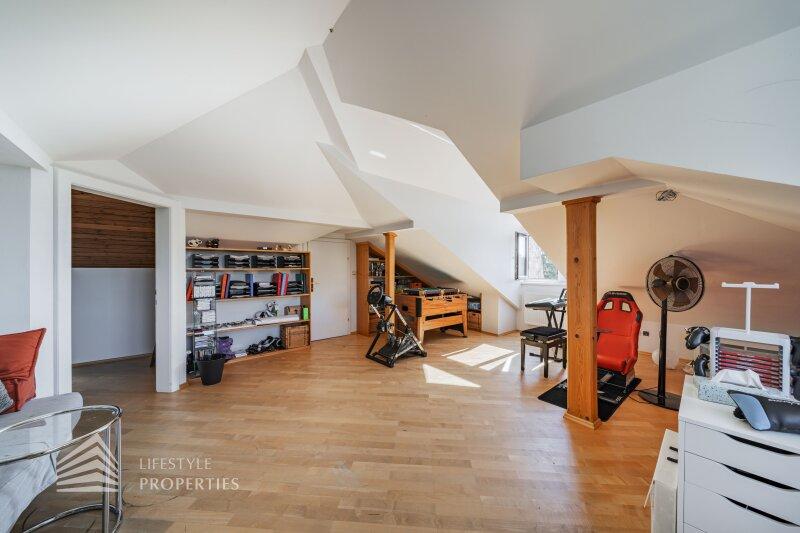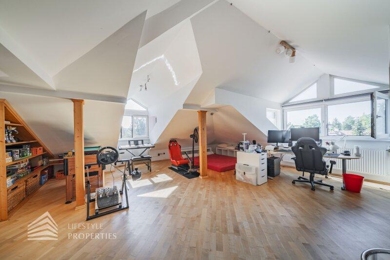 Neben dem Zubau 2006 wurde ebenso der Dachboden ausgebaut und wärmegedämmt um zusätzliche Wohnfläche zu schaffen. Auf den Plänen leider nicht vorhanden, aber auf den Fotos sehr gut zu sehen, führt eine Wendeltreppe im Obergeschoß hoch zu einem großen Zimmer im Dachgeschoß. Dieses Zimmer punktet durch eine enorme Geräumigkeit und große Fensterfronten, die das Zimmer mit natürlichem Licht nahezu fluten.