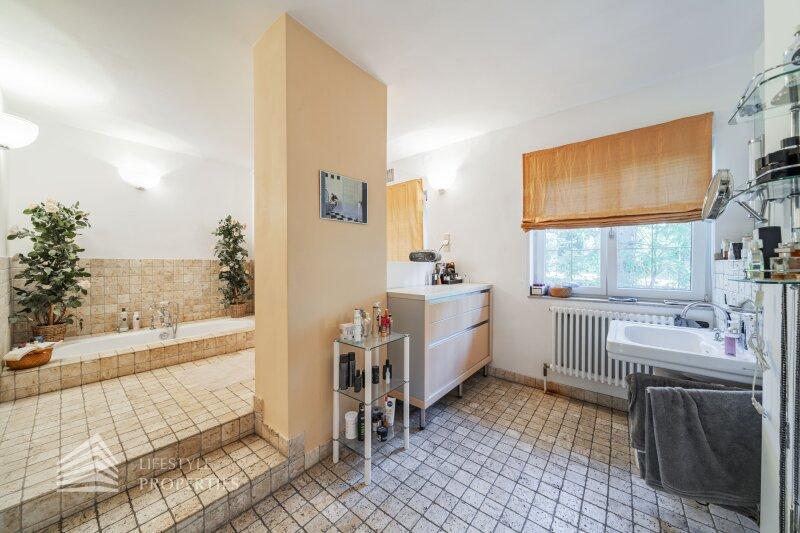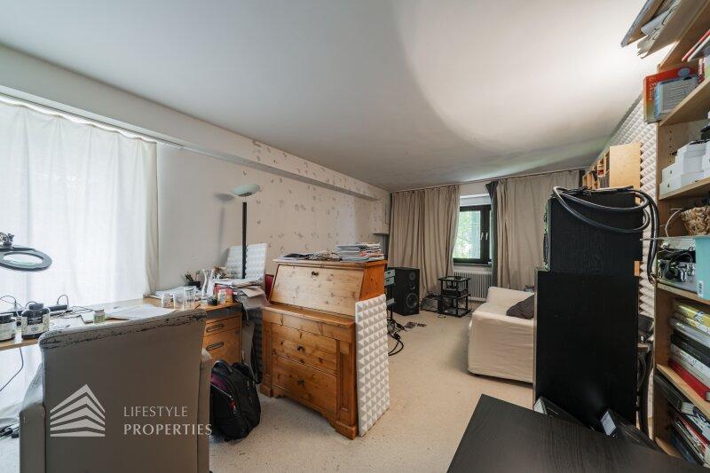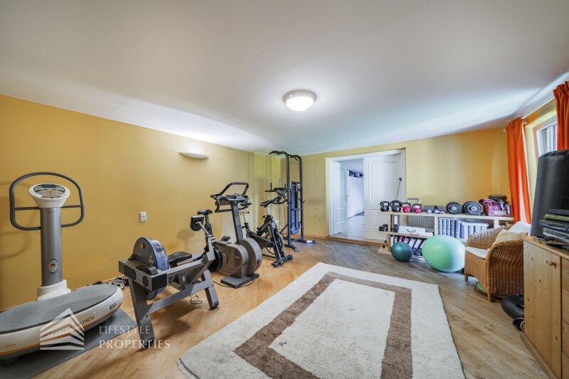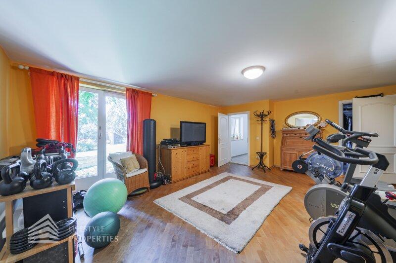 Die Wohnfläche von ca. 385 m² erstreckt sich über 3 Ebenen. Durch eine Eingangstür gelangen Sie in die großzügige Diele. Im Erdgeschoss finden Sie ein Schlafzimmer, ein Bad und ein separates WC, ein Lager, einen Abstellraum, einen Heizraum und einen nebenliegenden Wirtschaftsraum, einen Fitnessraum mit Durchgang zu einem begehbaren Kleiderschrank und zuletzt einen Gästezimmer.