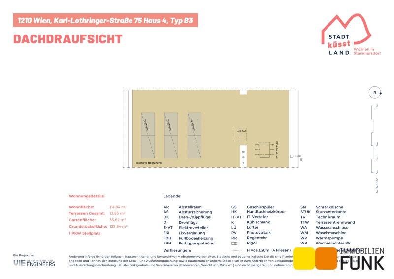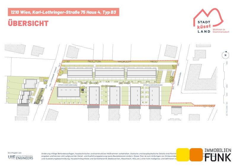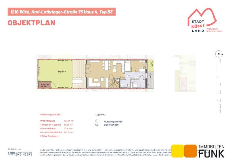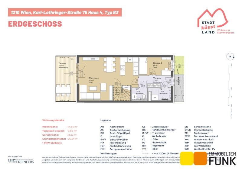 Das Reihenhaus 4 befindet sich in der Karl-Lothringer-Straße 75, 1210 Wien und wird auf einem ca. 126 m² großen Eigengrund errichtet. Seinen künftigen Bewohnern bietet es zudem eine komfortable Wohnfläche im Ausmaß von insgesamt ca. 114 m², angeordnet auf zwei Geschoßen mit 5 Zimmern, 2 Toiletten, einem großen Badezimmer, dem Technikraum und zwei Abstellräumen, sowie einer südseitig ausgerichteten Terrasse mit ca. 13 m², die sich zu einem gemütlichen Gartenbereich mit ca. 34 m² öffnet. Diesem Reihenhaus ist ein Parkplatz in der Nähe des Objekts zugewiesen. Der Kaufpreis für den KFZ-Platz beträgt 19.000,00 € .