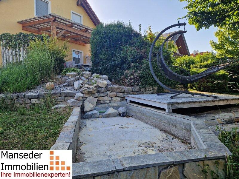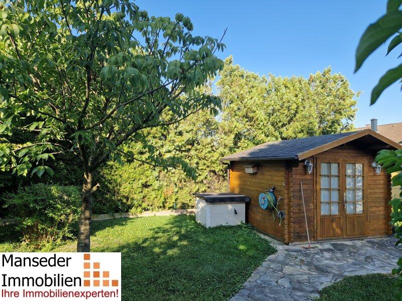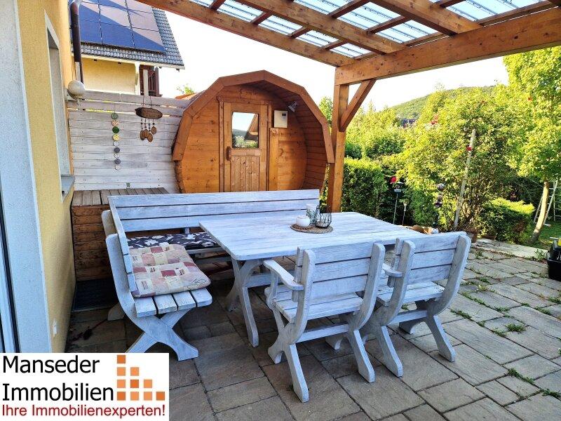 Vom Wohnzimmer gelangen Sie auf die wunderbare, ostseitig ausgerichtete, überdachte große Terrasse und den besonders charmanten Garten. Hier werden Sie im eigenen Paradies so manch gemütliche Zeit und schöne freie Tage verbringen. Nach einem anstrengenden Tag findet man hier zur Ruhe und kann die Seele baumeln lassen. Auch so manche Home-Office-Arbeit lässt sich hier leichter erledigen und werden Sie dadurch Ihre Arbeit wie Freizeitvergnügen erleben. Eine tolle Fass-Sauna (mit Platz für 4 Personen) ist ein absolutes Highlight auf der Terrasse.