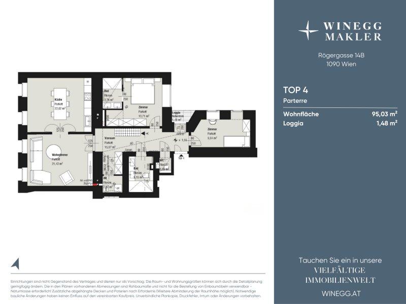 Der Drei-Zimmer-Erstbezug mit ca. 95 qm Wohnfläche zzgl. ca 25 qm Terrasse sowie ca. 1,5 qm Loggia befindet sich im Parterre und ist straßen- sowie hofseitig ausgerichtet.