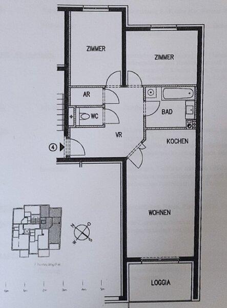 Die Wohnung verfügt über ein geräumiges Wohnzimmer mit offener Küche und Zugang zur Loggia, die in den ruhigen Innenhof ausgerichtet ist. Des Weiteren erwarten Sie zwei gemütliche Schlafzimmer sowie ein modernes Badezimmer. Das WC ist separat gestaltet. Praktischen Stauraum bietet der Abstellraum.