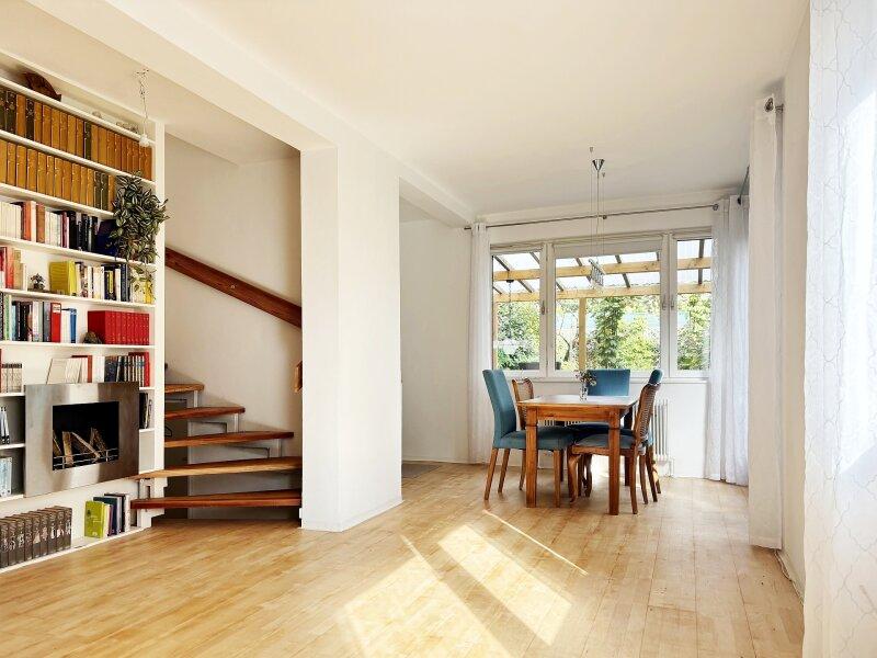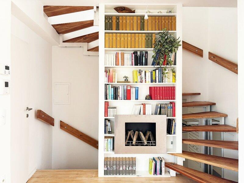 Dazu kommt die gepflegte, helle Maisonette Wohnung mit etwa 78 m2 Wohnfläche, die sich anfühlt als lebe man in einem Einfamilienhaus. Ihre Geschosse sind übereinander angeordnet und große Fensterflächen lassen viel Licht hinein. Auch hier haben die Eigentümer mit viel Liebe und gestalterischem Know-How eine echte Oase geschaffen, die einen sofort umfängt und in positive Stimmung bringt.