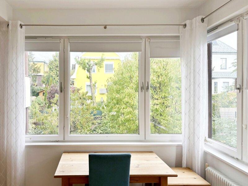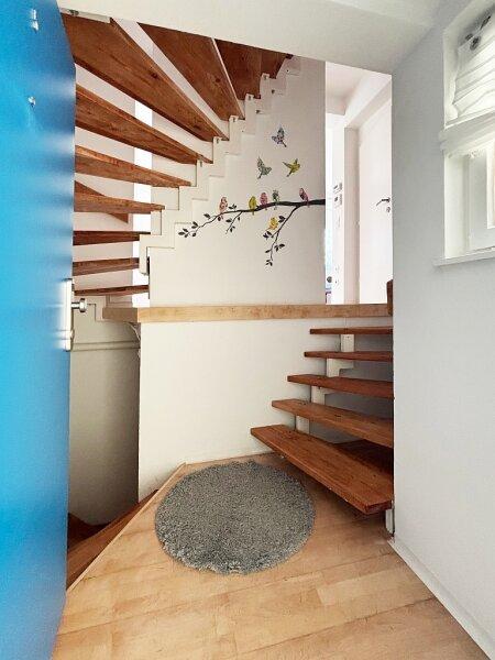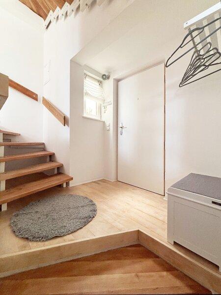 Der Zugang zur Maisonette Wohnung erfolgt über das helle Stiegenhaus mit Atrium im Erdgeschoss des Hauses. Sie verfügt über etwa 78m² Wohnfläche. Im Jänner 2025 wurde die gesamte Wohnung weiss ausgemalt und alle Fenster und Türen gestrichen. Die Fenster wurden vor ein paar Jahren professionell abgedichtet, lassen viel Sonne und Licht hinein und erlauben eine wunderbare Aussicht in den Garten.