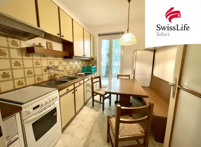 Die Küche ist derzeit getrennt, kann aber optional geöffnet werden, um eine moderne Wohnküche zu schaffen. Von hier gelangt man direkt auf den Balkon perfekt für Frühstück im Freien oder als Platz für Pflanzen.