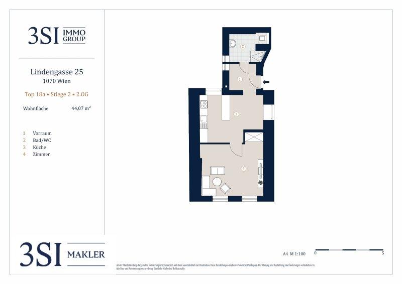 Dieses möblierte 2-Zimmer-Apartment verfügt über rund 44m² Wohnfläche und überzeugt durch eine optimale Raumaufteilung und die zentrale Lage im 7. Bezirk. Sie besticht durch ihren durchdachten Grundriss und teilt sich wie folgt auf:
