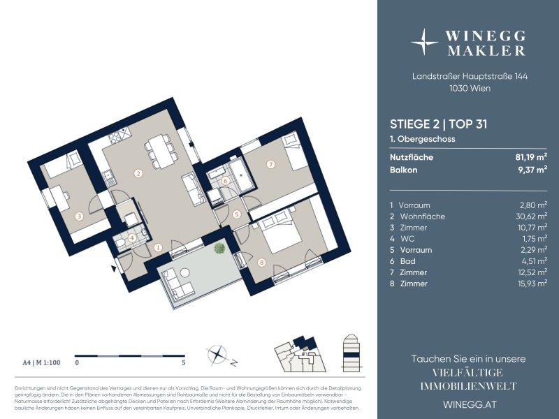 Die Wohnung ist nur hofseitig in alle Himmelsrichtungen ausgerichtet und teilt sich wie folgt auf: