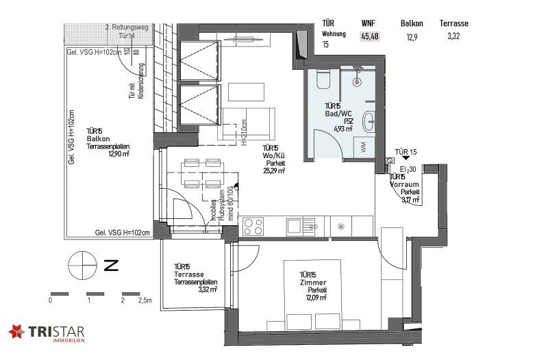 • WNFL ca. 47,45 m² (2 Zimmer) + Terrasse ca. 6 m² + ER (Keller) ca. 2,75 m²