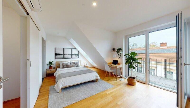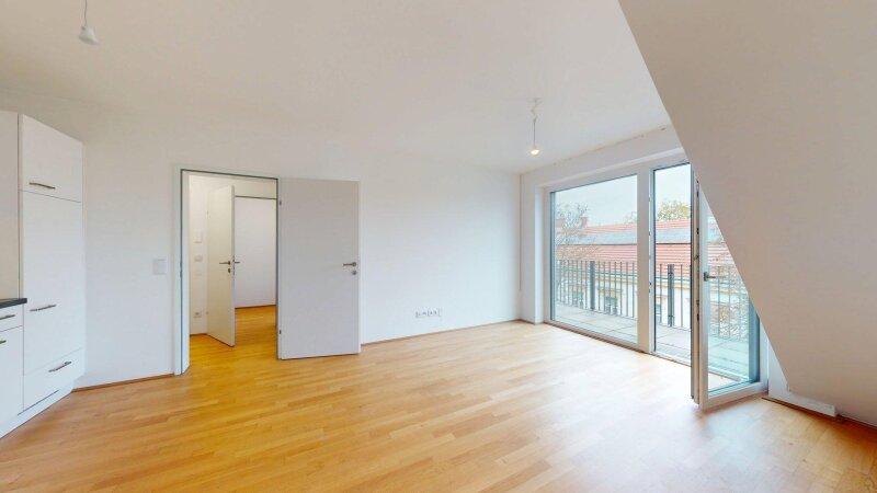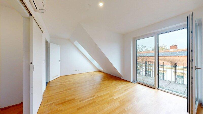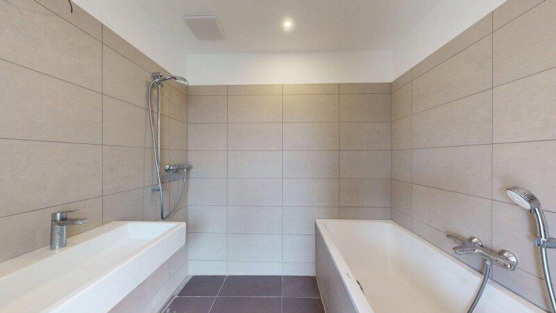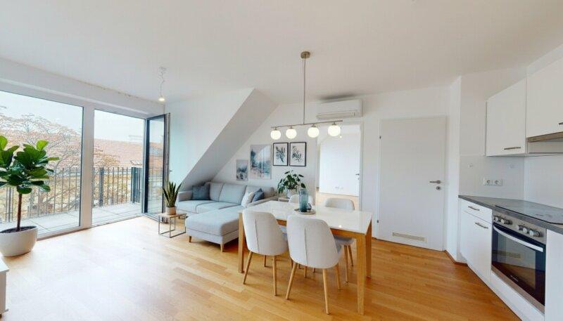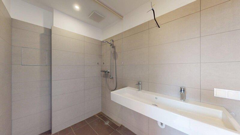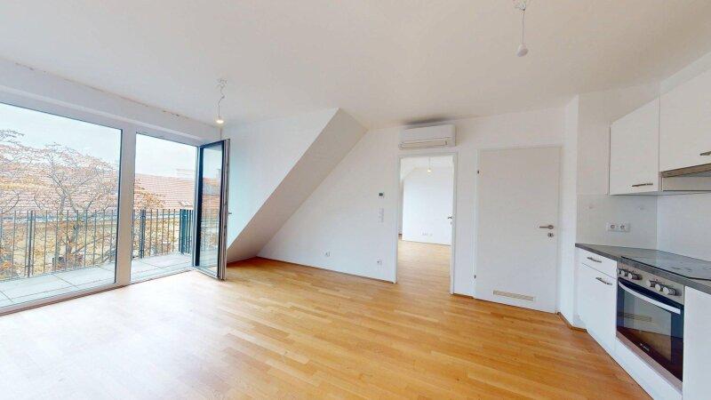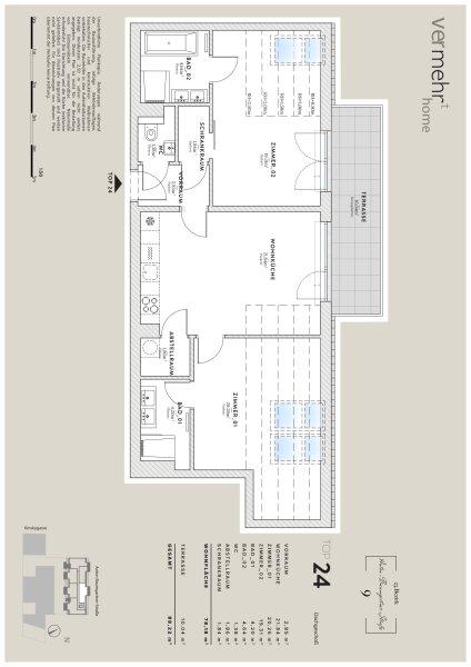Aufgeteilt auf 3 Zimmer befinden sich auf ca 78m² Wohnfläche insgesamt 1 Vorzimmer, 1 Toilette, 2 Badezimmer en suit, 1 Abstellraum, 1 Schrankraum, 1 Wohnzimmer mit offener Wohnküche und 1 angrenzender Terrasse mit 10m², sowie 2 Schlafzimmer, eines davon mit Ausgang auf ebendiese 10m² große Terrasse.