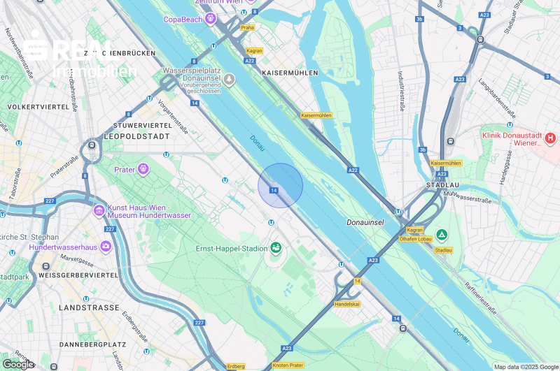 Die Wohnhausanlage, Baujahr 1974, befindet sich direkt am Handelskai zwischen Meiereistraße und Doktor-Natterer-Gasse. Zu Fuß oder mit dem Fahrrad erreicht man in wenigen Minuten die Donauinsel und in weiterer Folge auch den Wiener Prater. Die S-Bahnstation ist in ca. 10 Minuten und die U-Bahn Station "U2-Stadion" in ca. 5 Minuten erreichbar.