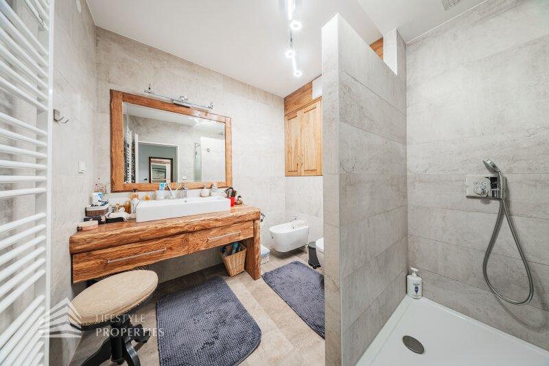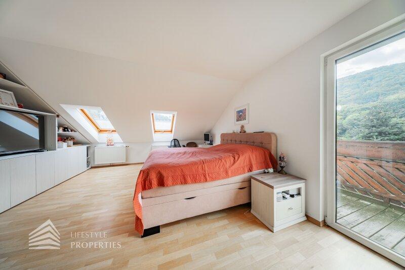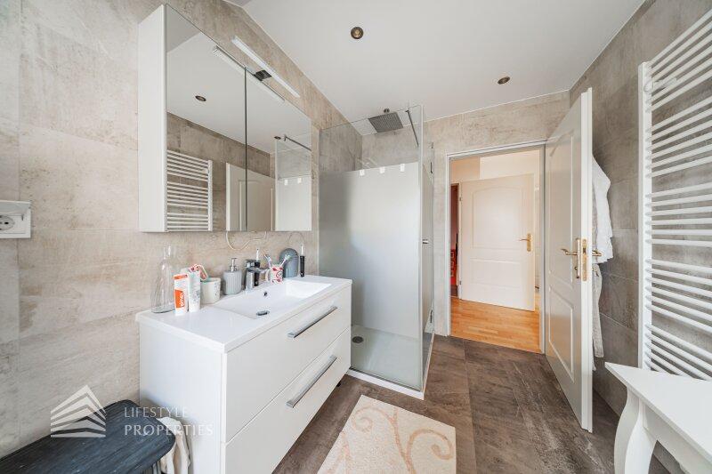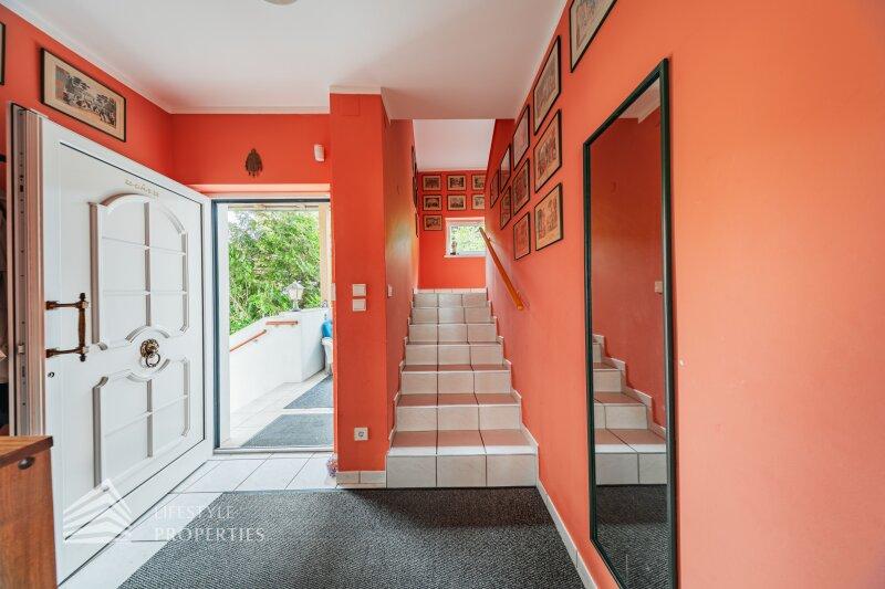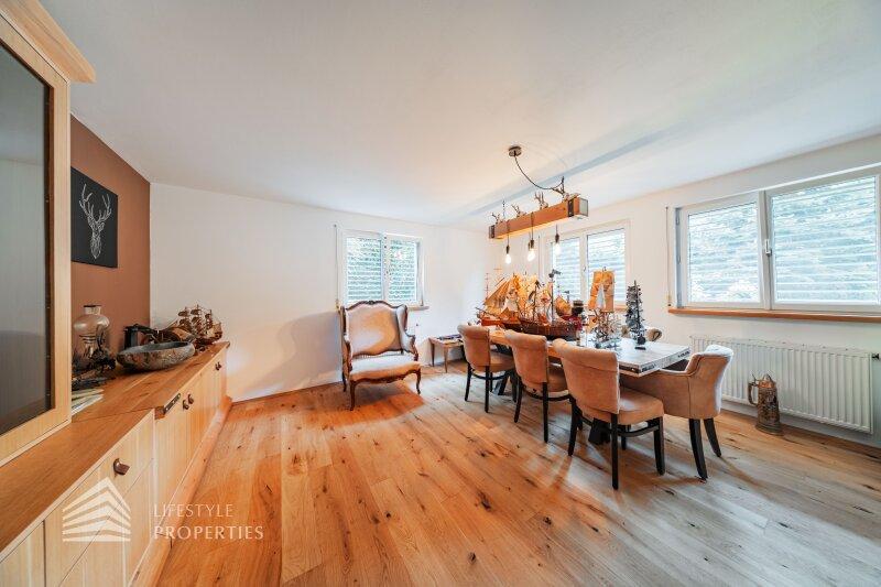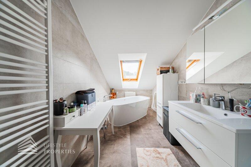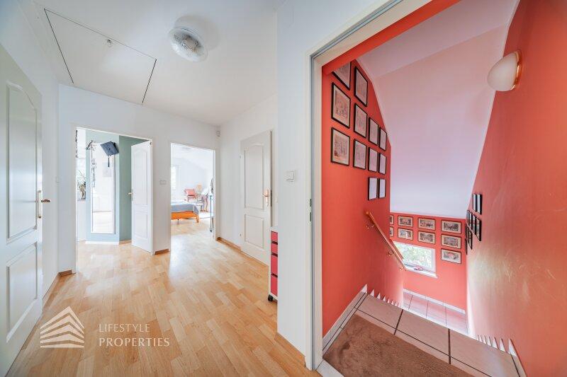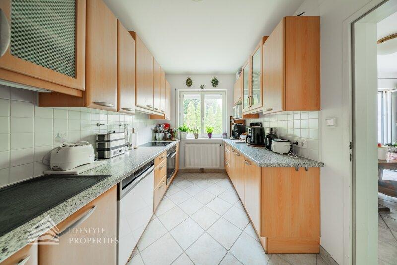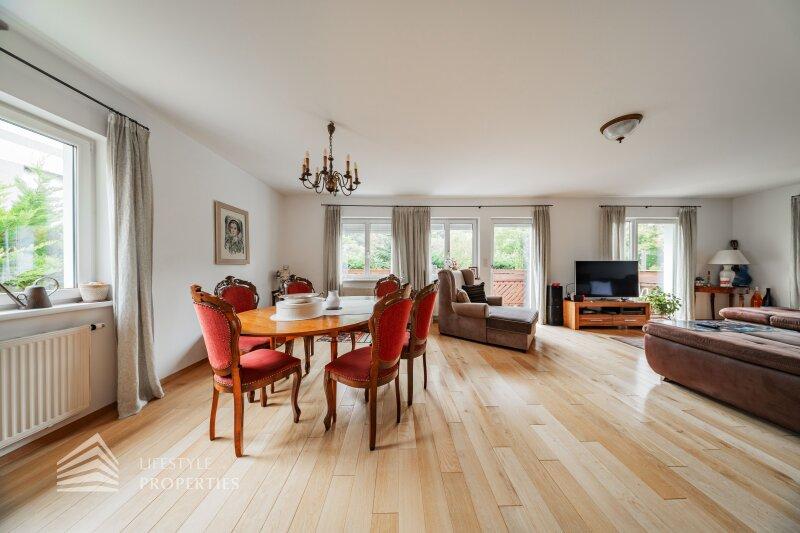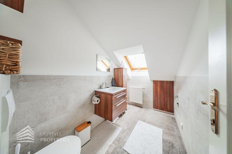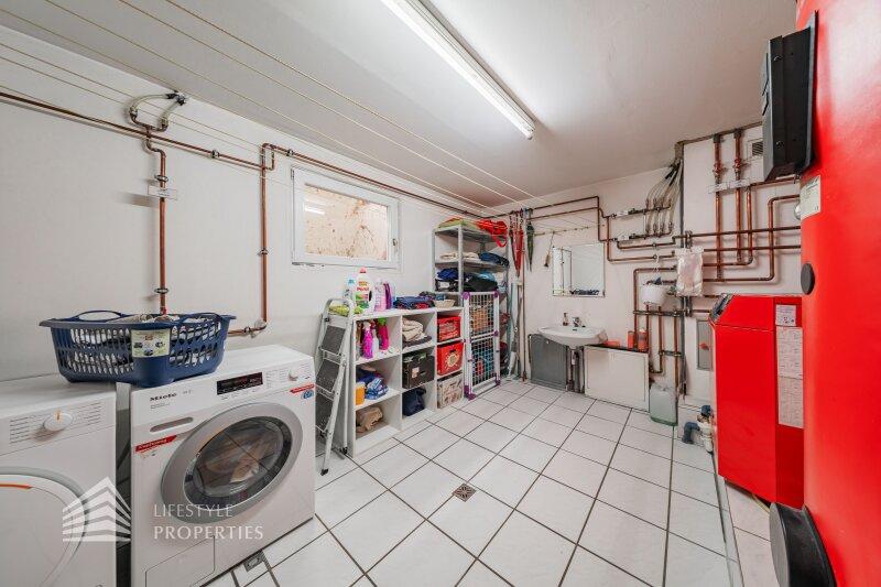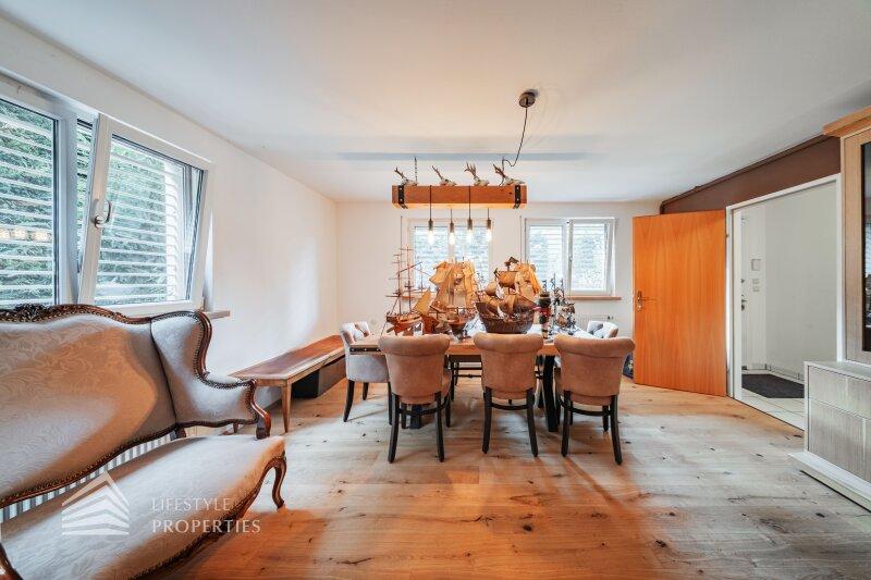 Die Villa mit einer Nutzfläche von ca. 333 m² vereint Luxus, Natur und Flexibilität auf einzigartige Weise. Eingebettet in ein ruhiges Grundstück von über ca. 1.098 m², bietet sie großzügige Räume, maßgefertigte Einbaumöbel, modernste Technik und absolute Privatsphäre, ein Zuhause, das höchsten Wohnkomfort und eleganten Lebensstil harmonisch verbindet. Das Haus unterteilt sich ein Kellergeschoss, ein Erdgeschoss und ein Dachgeschoss und bietet 7 Zimmer, 3 Bäder, 2 Küchen, eine Garage, einen Haustechnikraum, Kellerräume sowie mehrer Abstellräume. Technisch überzeugt die Villa durch eine Gasheizung kombiniert mit Fußbodenheizung und Radiatoren, einen 200-Liter-Warmwasserspeicher, hochwertige Internorm-Fenster, ergänzt durch Velux-Dachfenster, elektrische Außenrollläden an den Terrassentüren und manuelle Rollos an den übrigen Fenstern. Eine Alarmanlage schützt das gesamte Haus. Maßgefertigte Einbaumöbel nach Wunsch sind im Kaufpreis enthalten; ein Teil des weiteren hochwertigen Inventars kann ebenfalls übernommen werden. Die hochwertigen Böden aus Parkett, Fliesen und Naturstein verleihen dem Haus zeitlose Eleganz.