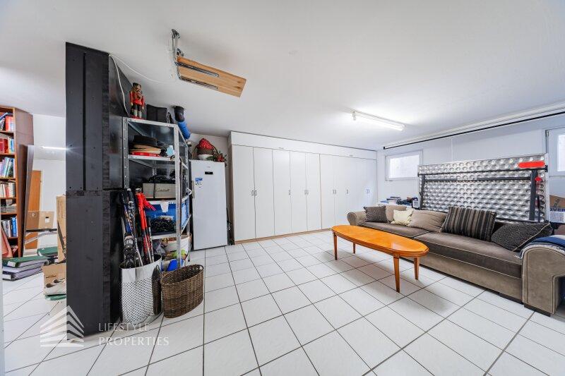 Im Untergeschoss befinden sich eine Garage mit elektrischem Tor und direktem Zugang ins Haus, ein großzügiger Partyraum, ein teilweise abgetrennter Fitnessbereich sowie ein behaglicher Raum mit stilvollem Ambiente ideal zum Entspannen, für private Momente oder auch als Cigar-Lounge nutzbar. Zusätzlich ist ein vorbereiteter Raum für eine Sauna mit vorhandenem Abgasanschluss vorhanden, ergänzt durch ein Duschbad und ein separates WC. Drei Abstellräume sowie ein Heiz- und Technikraum mit integriertem Waschbereich runden diese Ebene ab. Über eine Sicherheitstür führt der Ausgang direkt auf Straßenniveau in den Eingangsbereich des Grundstücks.
