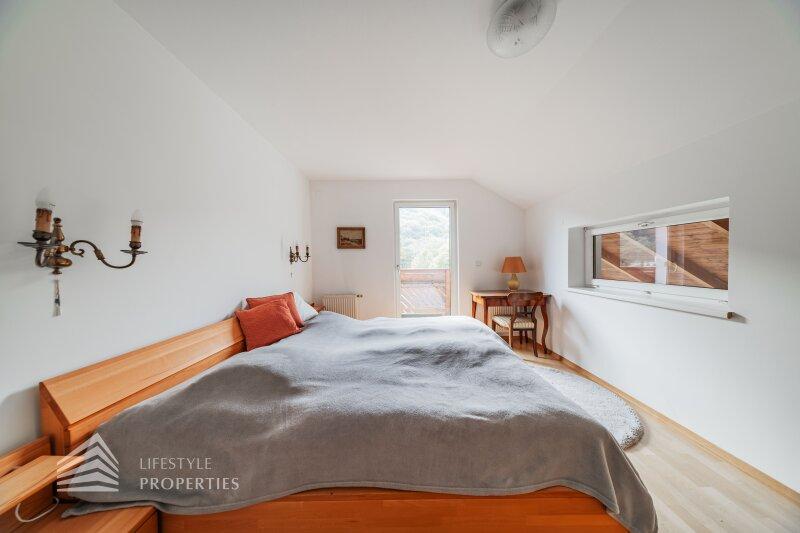Im Obergeschoss befinden sich drei helle Schlafzimmer, zwei davon mit Zugang zu einer Terrasse, das dritte mit Zugang zum Balkon. Eine der Terrassen bietet einen traumhaften Blick auf den gepflegten Garten und den Waldrand. Ein großflächiges Wohnzimmer, ebenfalls mit Zugang zum Balkon, ist ebenso auf dem Geschoss zu finden. Ein zentrales Badezimmer, ein separates WC mit Fenster und mit Waschmaschinenanschluss, eine kleine Küche und eine Speisekammer bieten zusätzlichen Komfort für Familien oder Gäste.