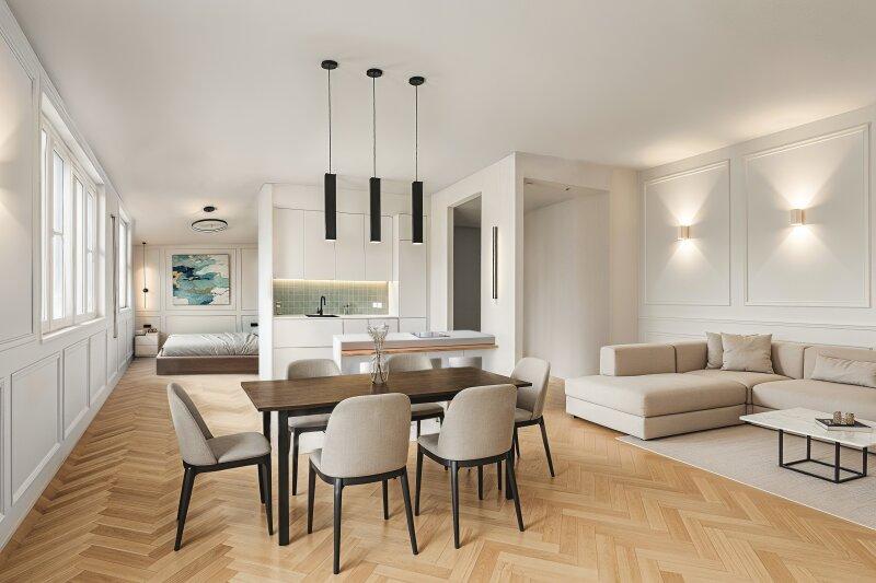 Die Wohnung wurde generalsaniert, inklusive aller Leitungen, und befindet sich im Erstbezug (ohne Küche).