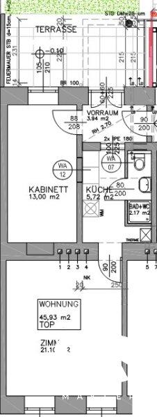 Zum Verkauf gelangt eine 2-Zimmer-Wohnung, ca. 45,93m² mit Terrasse, ca. 11,05m² im Erdgeschoß.