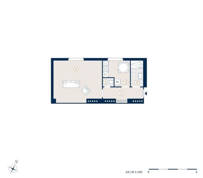 Die Wohnung gliedert sich in einen Vorraum, einen Wohn- Schlafraum, eine Küche, ein Badezimmer und ein separates WC.