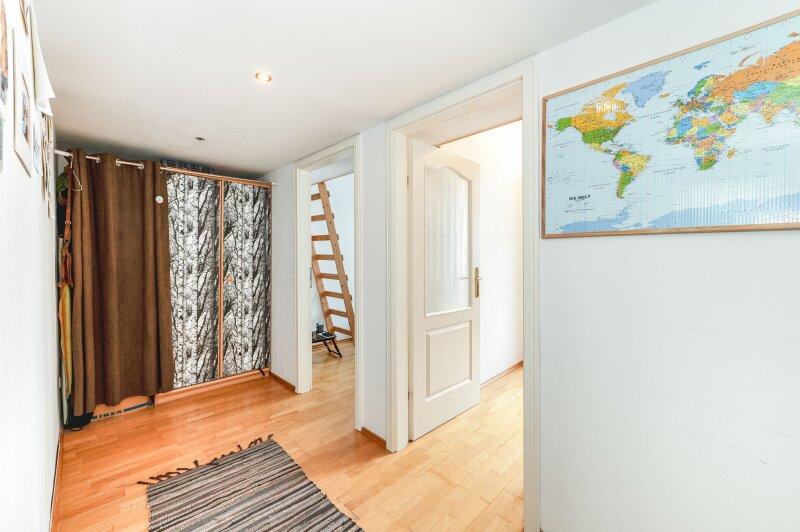 Ein besonderes Highlight ist das große Zimmer, das derzeit durch eine bauliche Maßnahme in zwei kleinere Räume unterteilt wurde verbunden durch eine charmante Treppenkonstruktion mit Stockbetten. Diese Lösung eröffnet flexible Nutzungsmöglichkeiten, etwa als Kinderzimmer, Arbeitsbereich oder Gästezimmer. Alternativ lässt sich hier mit geringem Aufwand wieder ein großzügiger Raum schaffen so entsteht wahlweise eine drei- oder vierzimmerige Wohnlösung.